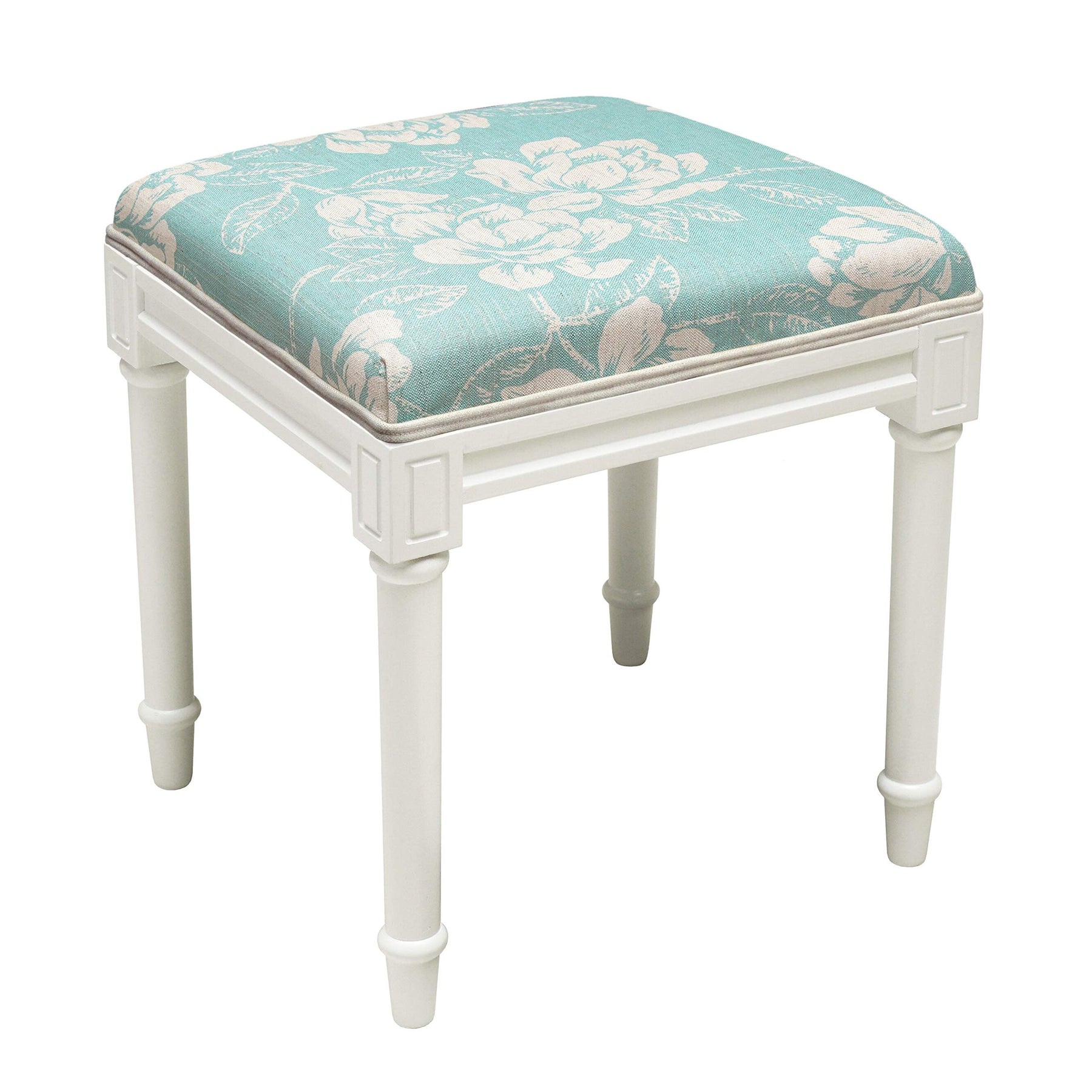 Aqua Magnolia Vanity Stool with White Frame Blue Floral Transitional Pattern Linen Painted Solid Wood