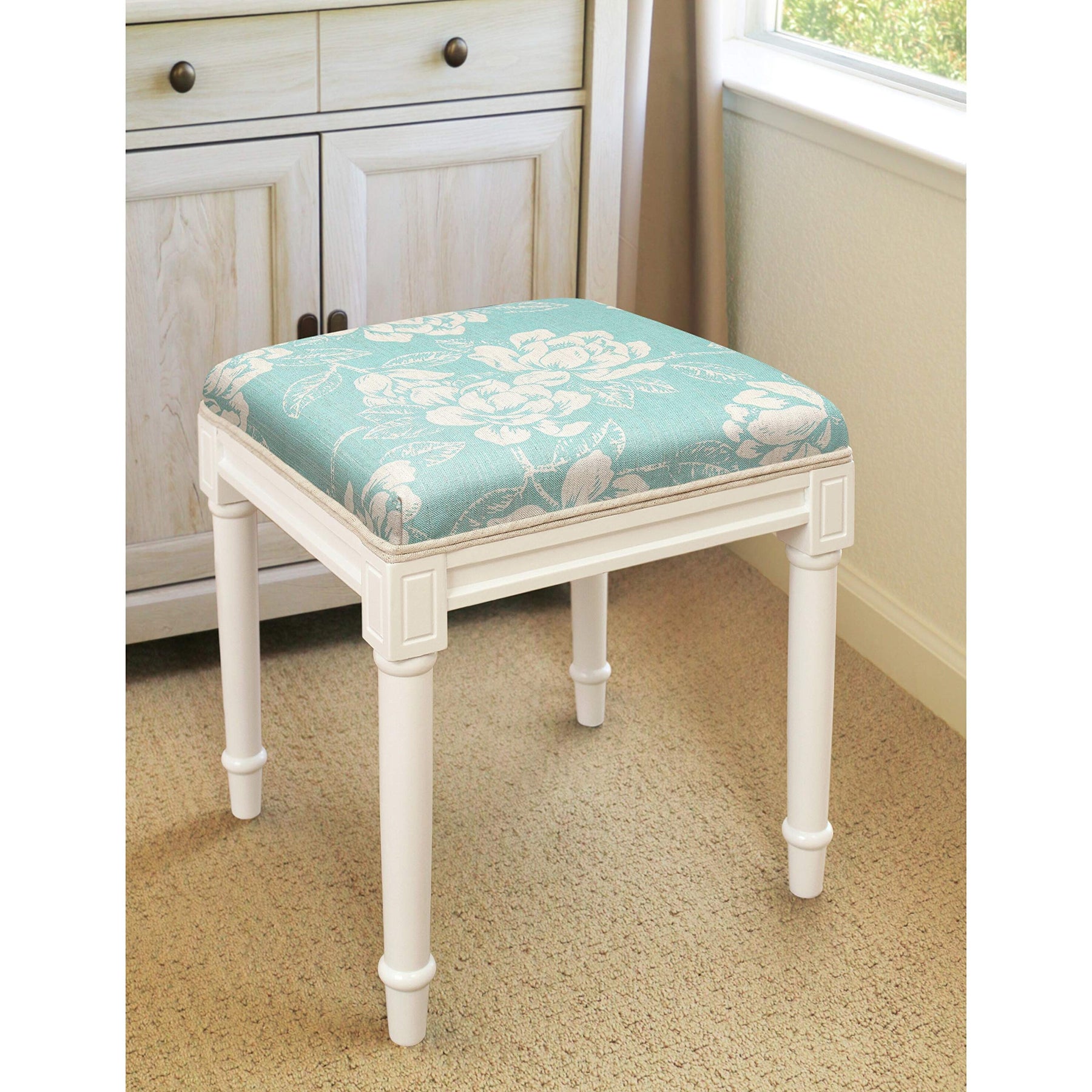 Aqua Magnolia Vanity Stool With White Frame Blue Floral Transitional Pattern Linen Painted Solid Wood | Assembly : Assembly Required. Finish : Painted. Pattern : Floral. Bench type : Vanity Stool. Frame material : Rubberwood. Print : Pattern. Material : Linen. Color : Blue. Solid Wood. Top material : Fabric | Product Size: 17.0 In. L X 19.0 In. H X 16.0 In. D.