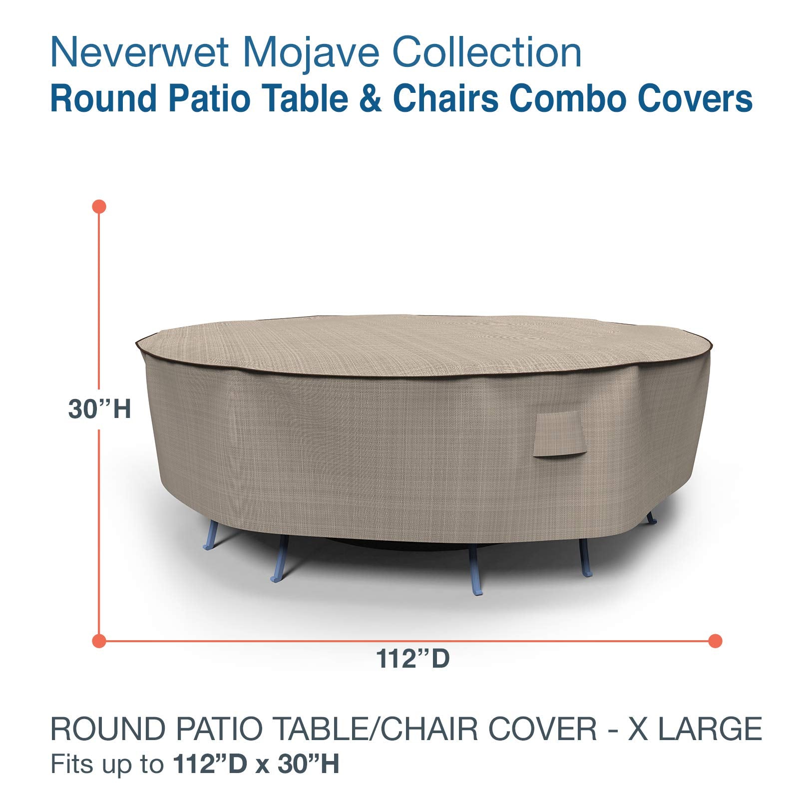 TASTEFUL AND TOUGH: Tastefully designed to match your patio set, this collection comes in an elegant black-and-ivory tweed pattern with dark gray piping and is contoured to fully cover your patio furniture. Meanwhile, our 600 denier polyester is strong enough to protect your furniture from the elements all year long | WE STAY DRY INSIDE AND OUT: The NeverWet Mojave collection combines the long-lasting durability of our machine-woven 600 denier polyester with groundbreaking Rust-Oleum NeverWet technology and sun protection. With NeverWet technology, water rolls right off this cover, taking mud, tree-sap, dirt and bird droppings with it. Meanwhile, sewn-in air vents reduce condensation and billowing. | DON'T SACRIFICE STYLE: With our NeverWet Mojave Collection you’ll never have to sacrifice style for protection. This collection will compliment nearly any preexisting patio décor, all while extending the life of your outdoor furniture | SECURE THROUGH THE SEASONS: Sewn-in strap and buckle systems keep your patio furniture cover in place in windy conditions | BUILT TO FIT: Designed with a contoured shape and elegant design for a custom-like fit. Cover Measures: 88" Dia. x 30" Drop
