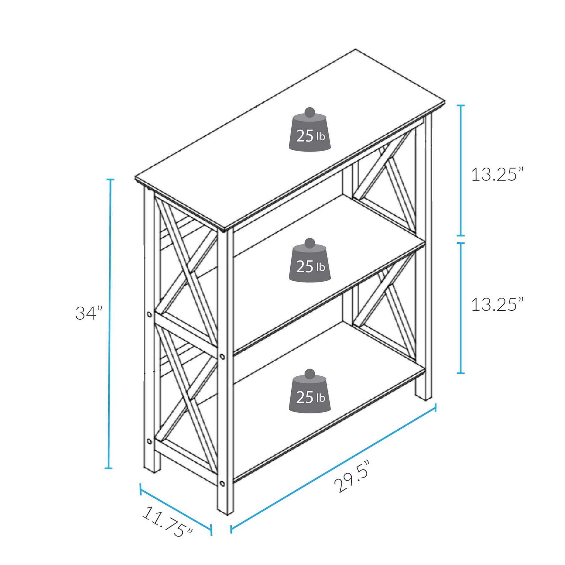 3 spacious shelves provide all the storage space you need. | Contemporary x-design styling gives this piece a chic, airy look that prevents books from falling. | 4 durable legs provide balanced support for your belongings. | Rich walnut finish accentuates your decor. | Solid wood construction for increased durability and longevity. Light and easy assembly.