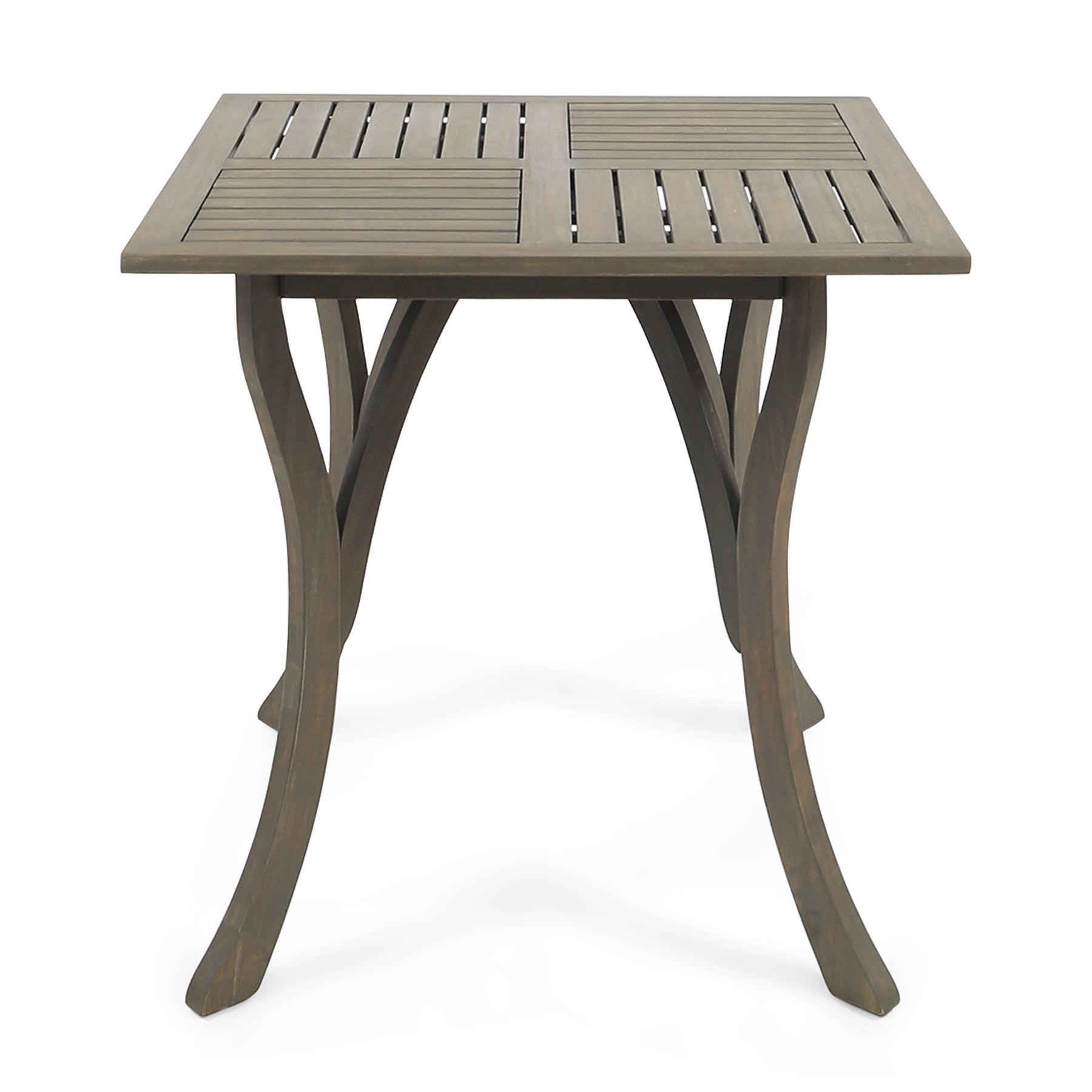 Enjoy this stylish outdoor acacia wood table, prefect for any patio set up. Feature a beautiful teak finish, this square table is a wonderful addition. The smooth lines of the legs give the table a calm, stylish look that complements the perpendicular wooden slats featured on the table top | Includes: One (1) Table. Material: Acacia Wood. Finish: Gray | Dimensions: 31.50 inches deep x 31.50 inches wide x 30.00 inches high | Some Assembly Required | Hand Crafted Details