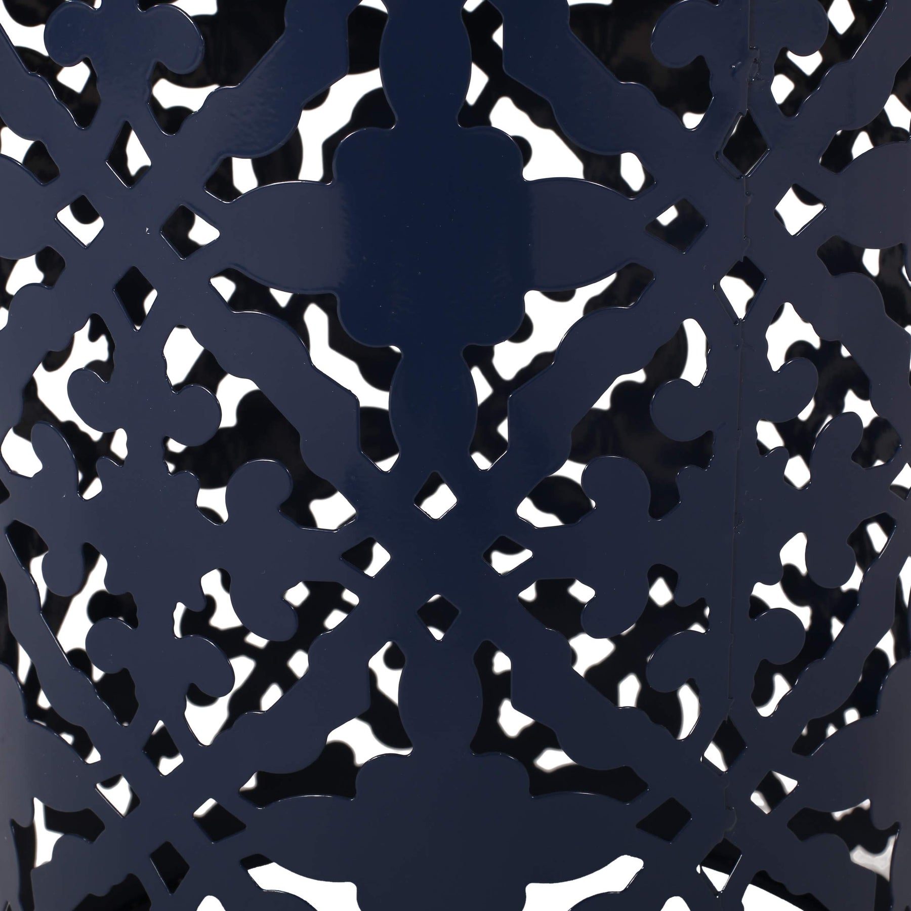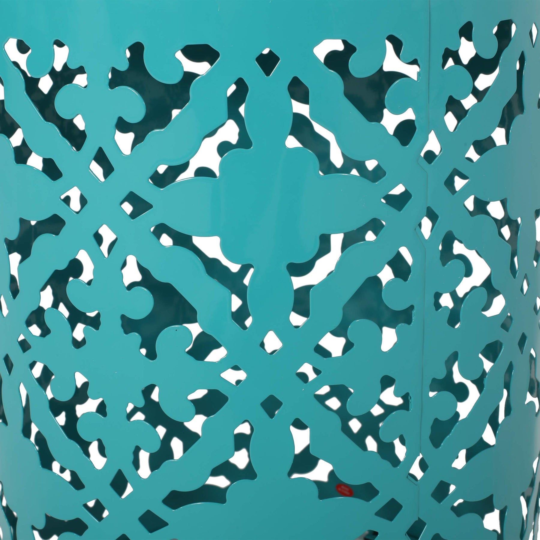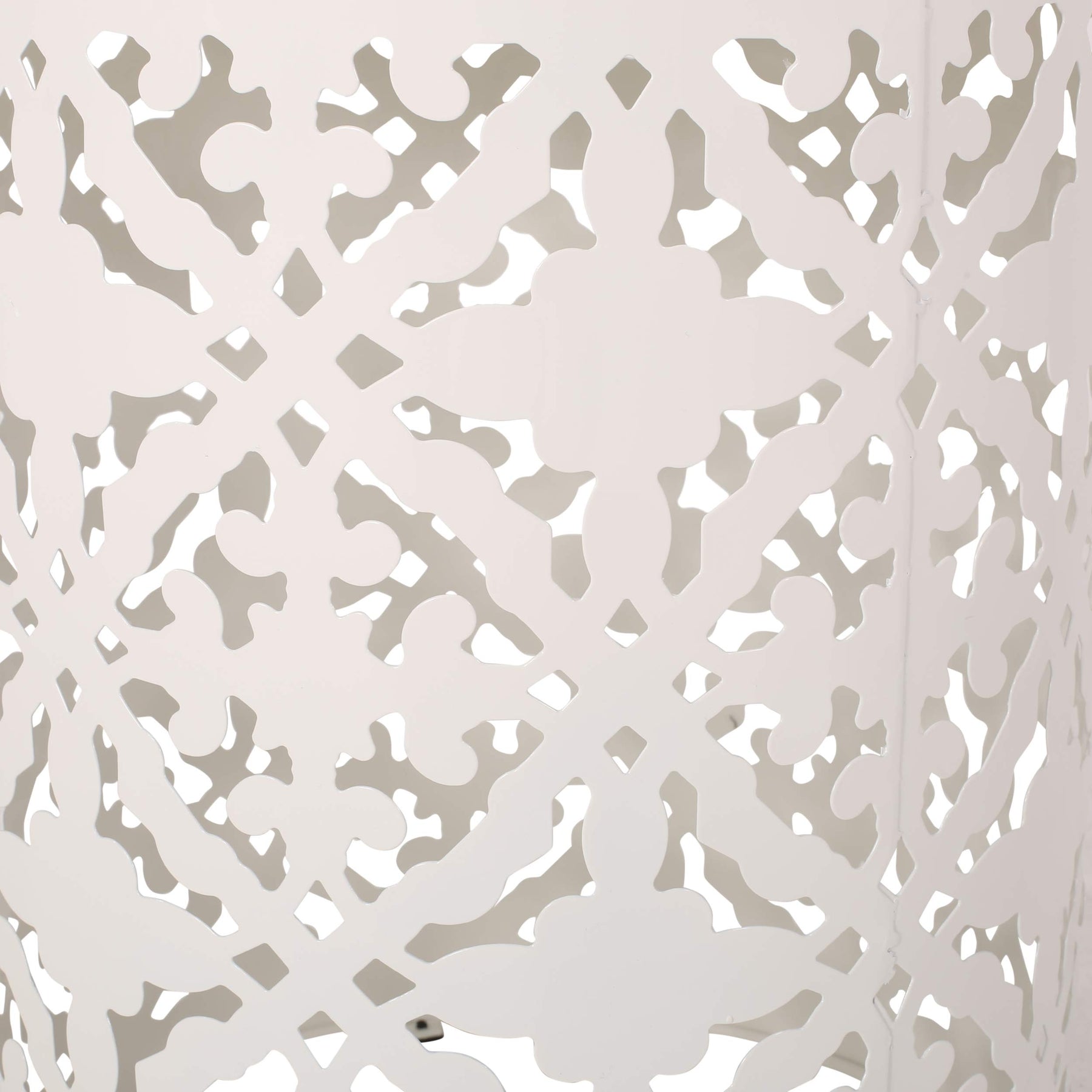 Mix style and function to create a trendy accent for your outdoor space. With a charming cylindrical structure and lace cut design, this end table is an excellent sidekick to your outdoor furniture, perfect for holding a tray of snacks or a pitcher of lemonade. This features a gorgeous tile mosaic tabletop that brilliantly blends a traditional touch with a sleek modern look. Also providing incredible stability, our accent table will have no problem keeping your patio in style all summer long. Includes: One (1) Table Top Material: Tile Frame Material: Iron Top Finish: Multi-Color Frame Finish: White Hand-Crafted Details Assembly Required Dimensions: 13.75 inches deep x 13.75 inches wide x 18.25 inches high