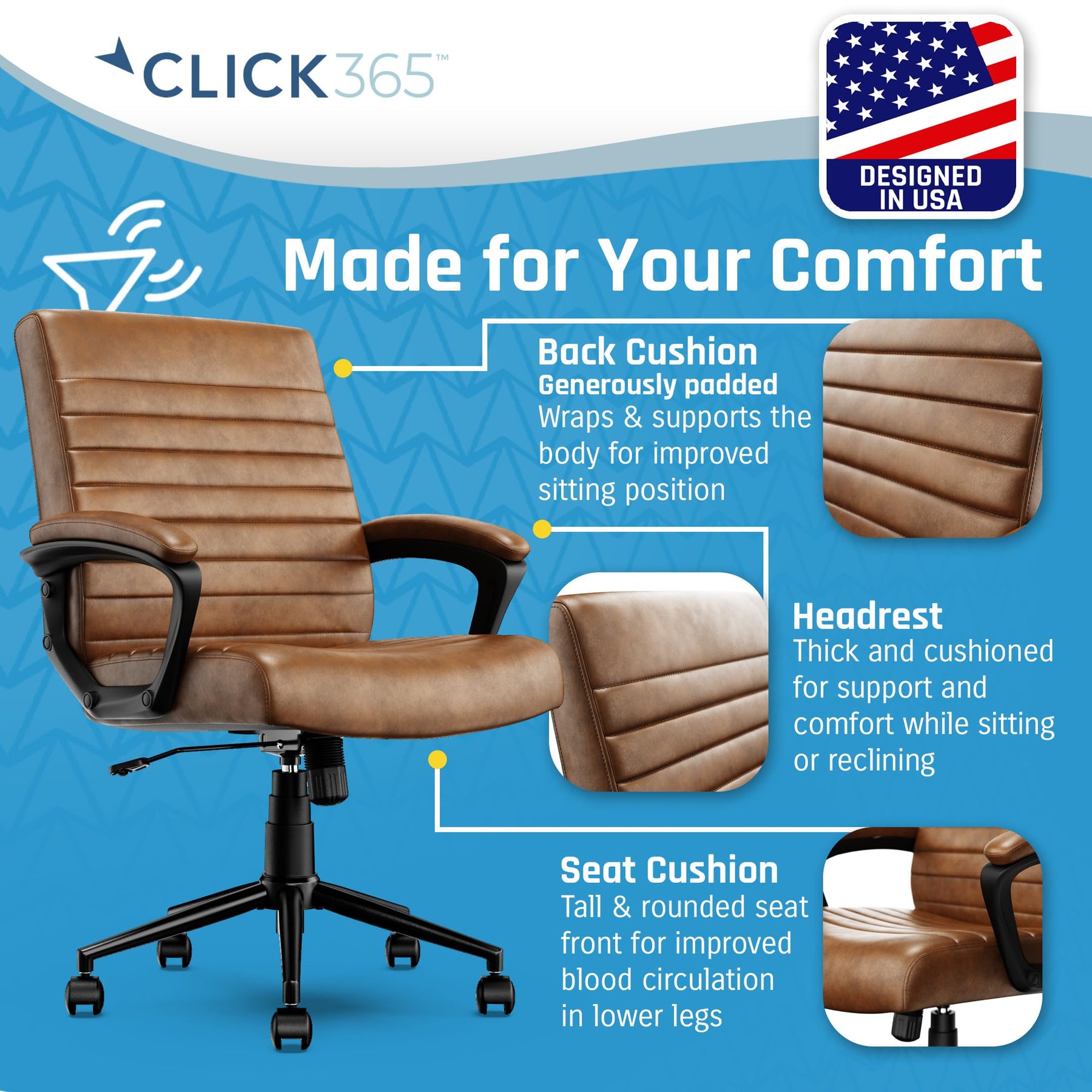 Bring relaxation to your busy workday with the Click 365 Extra Comfort Ergonomic Mid Back Desk Chair. This chair deliver American comfort with ultra plush padding in headrests, back rests and seat cushions. This chair has a contoured 5 inch thick seat cushion and reliable ergonomic support, providing long lasting comfort and is perfect for everyday use at home and in the office. Pneumatic adjustable height, a swivel base design, and top-graded smooth rolling caster ensure the office chair is easy to move and position. This desk chair is upholstered in premium durable bonded leather, high density foam, heavy duty metal base, with sophisticated stitching. You can purchase this chair with confidence.