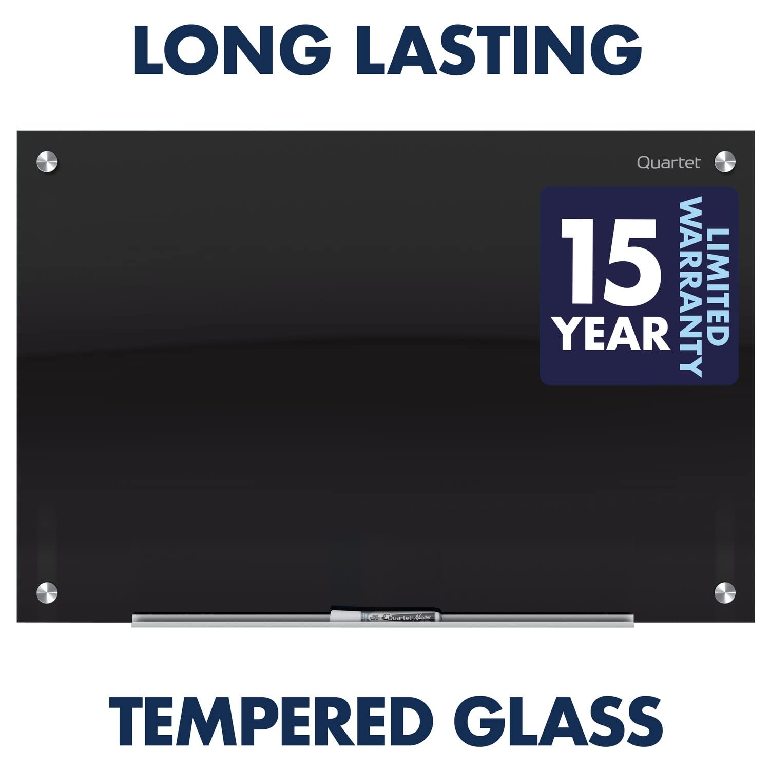 Quartet Infinity Glass Dry Erase Board blends versatile functionality with a modern upscale look. The frameless black glass design appears to float on your wall, making it a focal point of your space. As this board is made with non-absorbent glass, you can write, erase and rewrite on a clean surface, without fear of stains or ghosting. This board is designed for long-term performance. The strong tempered glass surface resists scratches and dents, and is ideal for heavy use. Plus, the magnetic, steel-backed glass makes it easy to hang papers and documents instantly. Great for meetings and presentations. Installation is simple with the included pass-through mounting hardware. As the screws insert through the front, you can hang the board accurately and evenly. Mount it vertically or horizontally to fit your space. Board comes with 15 year limited warranty, a removable accessory tray, one marker and two high power glass board magnets for your convenience.