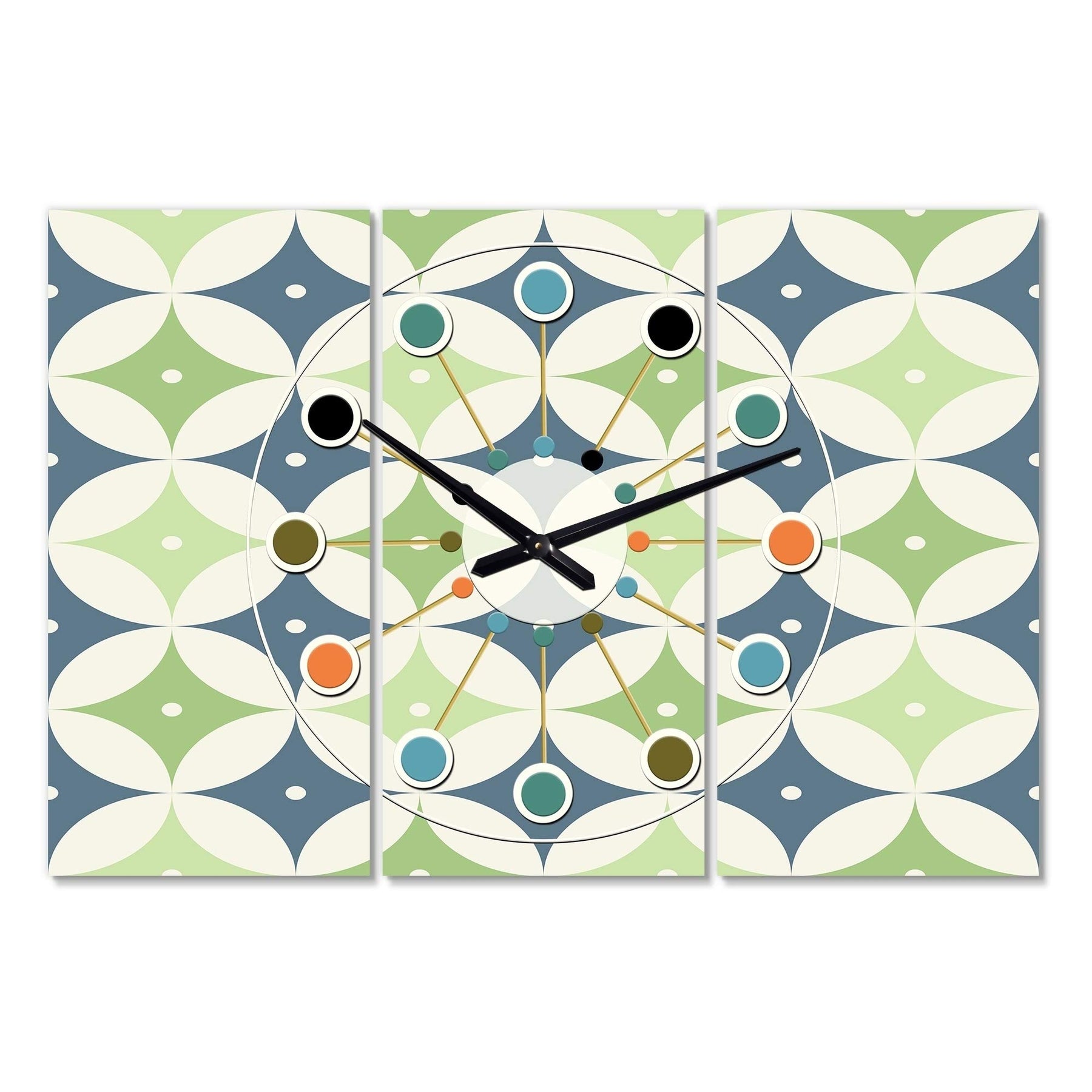 Retro Geometric Design V' Oversized Mid-Century Wall Clock - 3 Panels 36 in. Wide X 28 High Blue Green Modern Contemporary Vintage Aluminum Steel Finish Battery