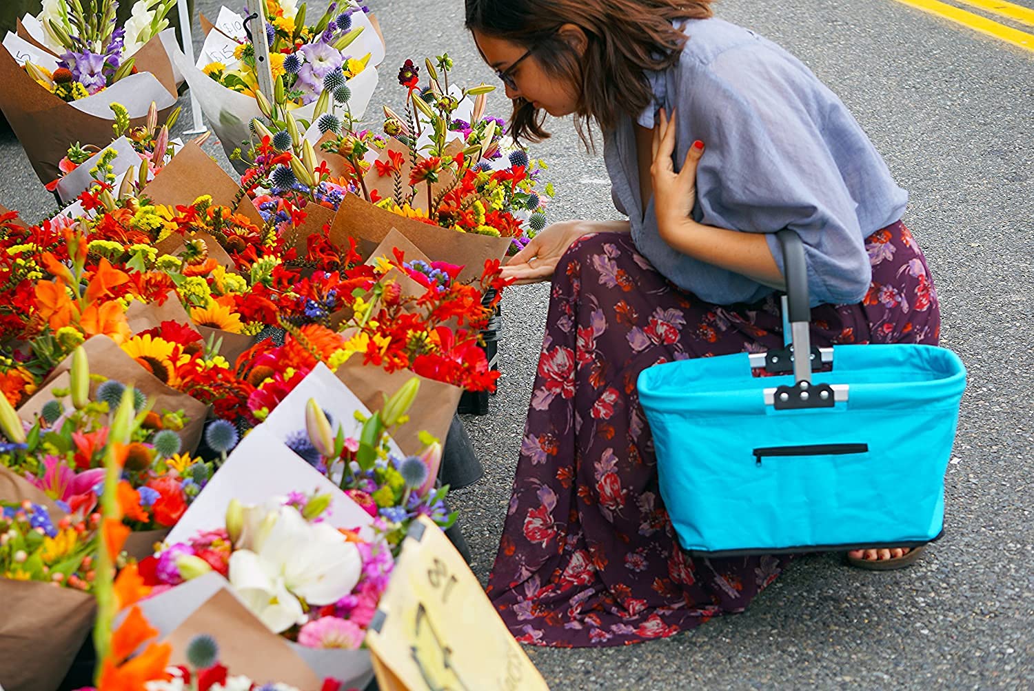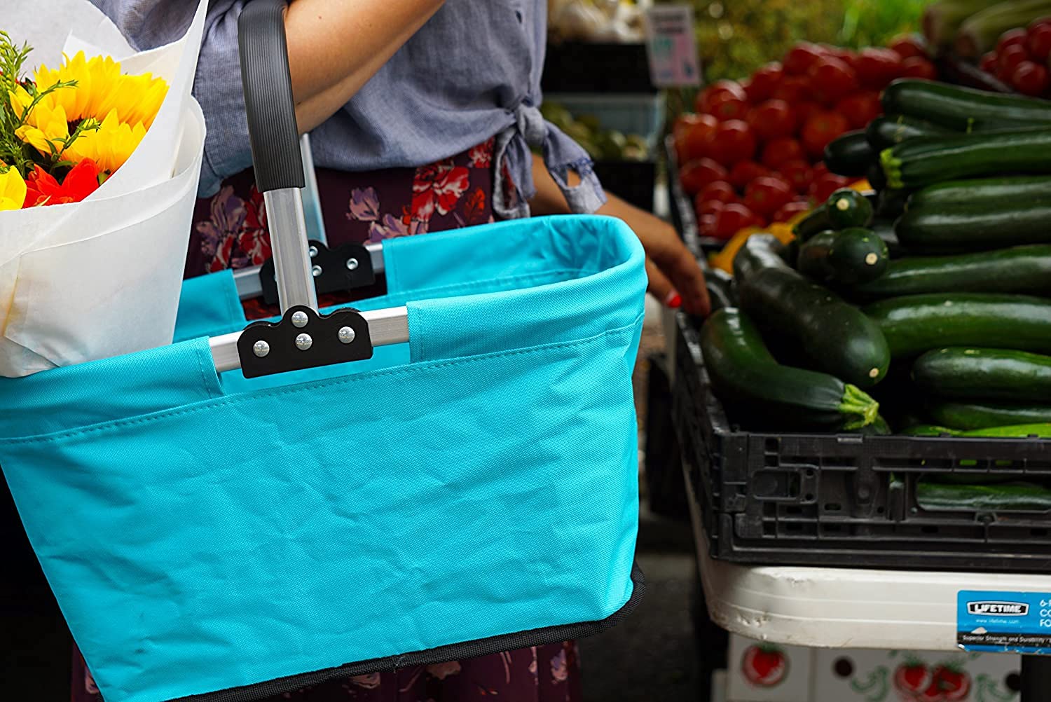 QUALITY MATERIALS: Made with a strong, yet lightweight aluminum frame and polyester fabric with a large zippered compartment on the outside to hold your phone, money or wallet | CONVENIENT SIZE: Basket unfolds and expands to approximately 26.5 quarts of volume, measures approximately 17 x 11 x 18" | MULTIFUNCTIONAL: The Perfect solution for groceries, farmers market produce, picnics, gardening supplies, knitting yarn or toys | EASY STORAGE: Folding it up and storing it couldn’t be simpler, just flatten and fold it in half for space-saving convenience; easily fits in your backpack, and car trunk; folded basket measures approximately 11.5 x 9.3 x 3.5 inches | EASY CLEAN: Spot clean when needed and let air dry