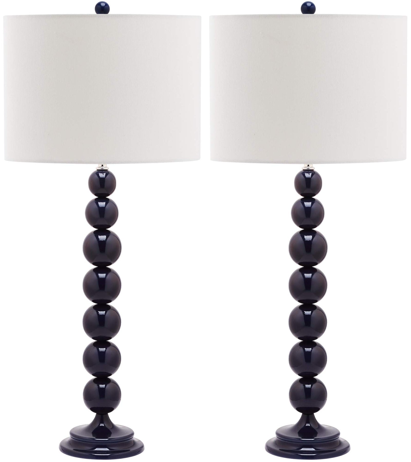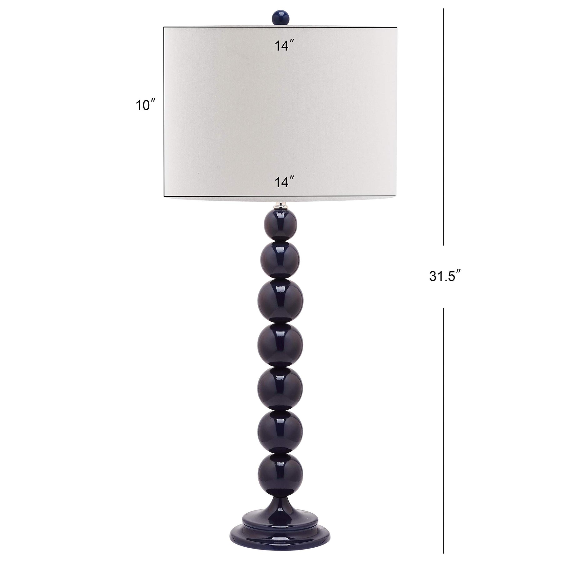 An eclectic modern style with a dash of fashion, these Jenna Table Lamps from Safavieh will instantly transform your décor into an abode of inspiration. The perfect symmetry of this shiny navy- colored stacked ball lamp adds extraordinary visual intrigue. Its tall, lean silhouette adds height on a console or hall table, and the uniform color of the base, neck, and final are complemented by the white cotton drum shade.Lamp Color: Navy Shade Fabric Material: Cotton Body Material: Metal Metal Finish: Navy Base and Neck Finial Color: Navy Harp Color: Silver Full Dimensions: 14 in. W x 14 in. D x 31 in. H Two (2) Compact Fluorescent light bulbs are included Item Weight: 9.9 lbs. Cord Length: 59.6 in.