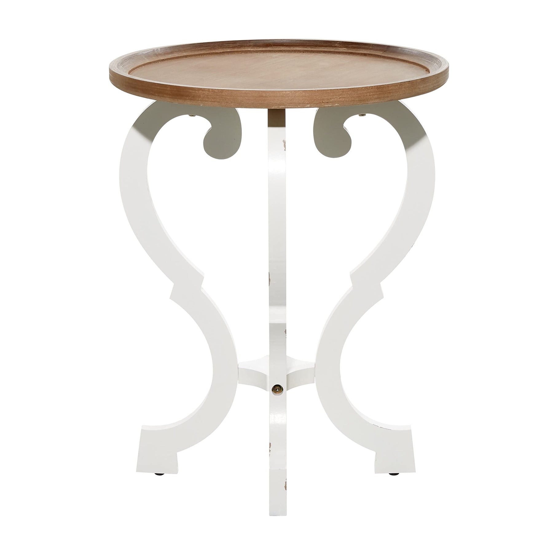 Scrolled Wood Round End Accent Table White Farmhouse French Country Finish Shelf | Decorative scroll leg base. Compact design ideal for small spaces. Two tone color combination. Works great as and end table. Place this design by your favorite chair or sofa. Wipe clean with damp cloth. Maximum weight 100 lb. Imported. Design/Look : Farmhouse, French Country. Material : Wood. Finish : Wood Finish. Frame material : Wood. Assembly : Assembly Required. Base type : 3 and 4 Legs. Color : White. Design : Table. Shelf. Shape : Round | Product Size: 19.0 In. L X 19.0 In. W X 25.0 In. H.