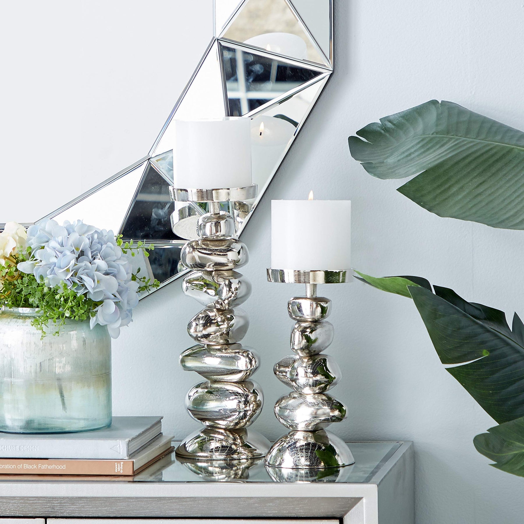 Silver Stacked Stone Candle Holders Set of 2 10" 14"