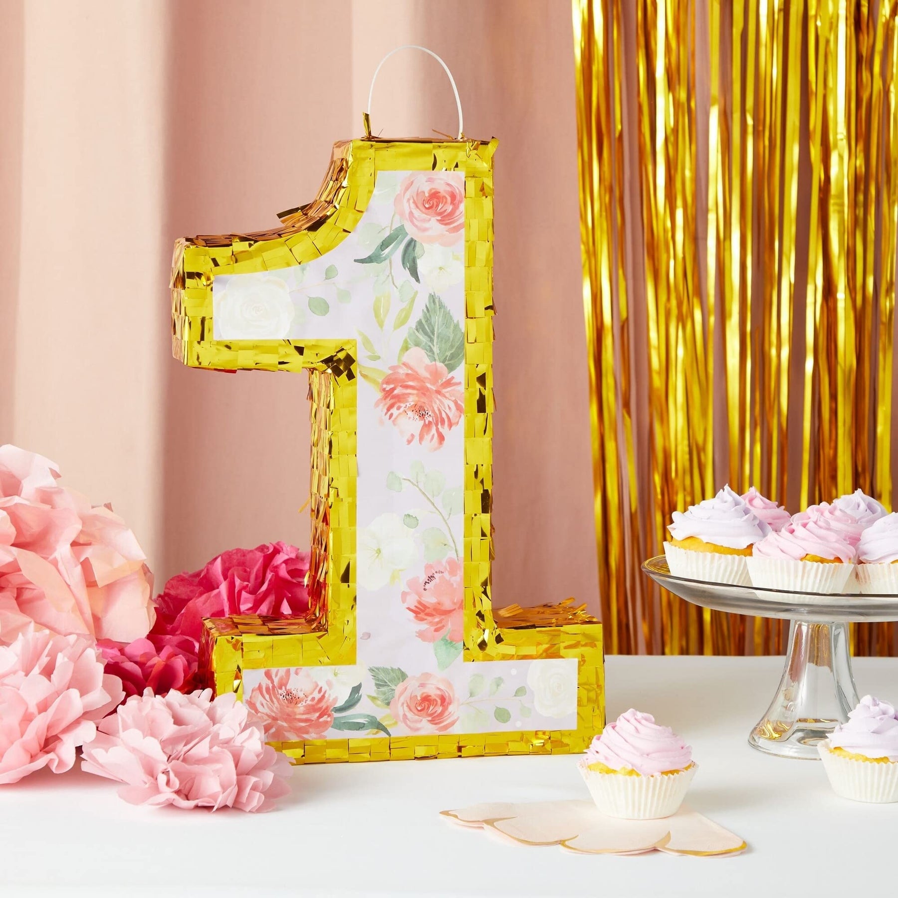 Small Floral Number 1 Pinata with Gold Foil + Pull