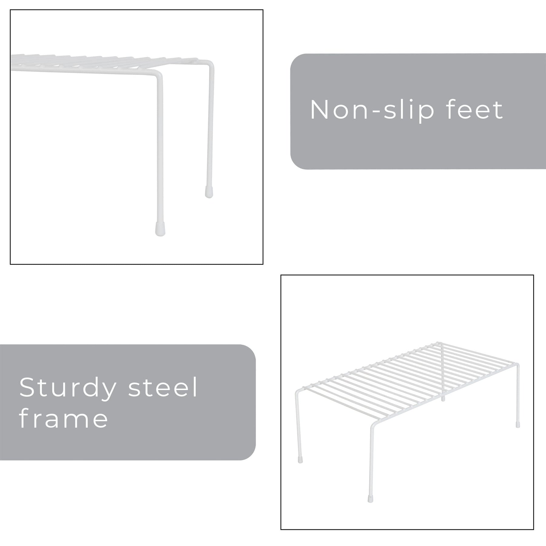 Free up your space: These pantry shelf organizers create 2 rows of optimal space for your cabinets and counters; storage rack dimensions: 13.25 x 8.5 x 5.75 in. (L x W x H) | Sturdy storage solutions: Wire shelf organizer made with a rust-resistant finish and soft, non-slip feet to avoid moving or scratching; this kitchen storage rack is made to provide lasting solutions for your home. | No assembly needed: This wire shelf rack requires no tools or assembly; simply take the pantry shelf rack out of the box and start optimizing your space. | Versatile organization: Our pantry organizer shelf will optimize and save space during any form of home improvement; use this wire shelf for pantry organization, saving office space, garage organization and so much more. | Smart Design, simplified living: As a family-owned company, we have been making people's lives more convenient for over 50 years; we offer storage & organization solutions that help people optimize their homes, offices & lives.
