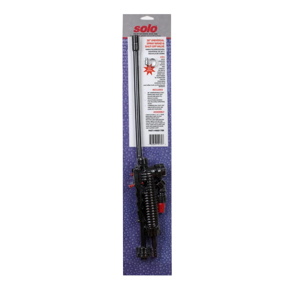 Solo 28-inch universal wand and shut-off valve assembly. A step up in quality and function with an unbreakable 20-inch wand fitted to our commercial grade shutoff valve, stainless filter screen, plastic adjustable and flat fan nozzle. Adapts to virtually all competitors sprayers. Solo's number 1 packaged accessory. Includes stainless hose clamp.