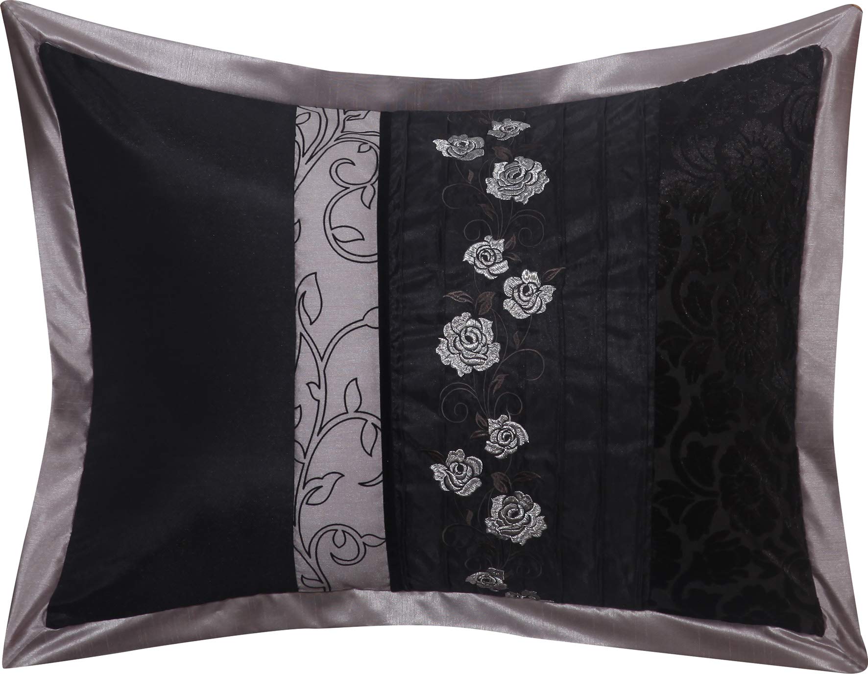 The Chloe Black 7 Piece Comforter Set by Stratford Park is luxury fit for any bedroom. A comforter, bed skirt, shams, and three accent pillows, crafted with polyester fabric, are included in this set. The comforter boasts a tailored banded design with flocked vine and embroidered floral prints. Both prints, and a flourish of ruffles, are echoed on the bordered shams and toss pillows.