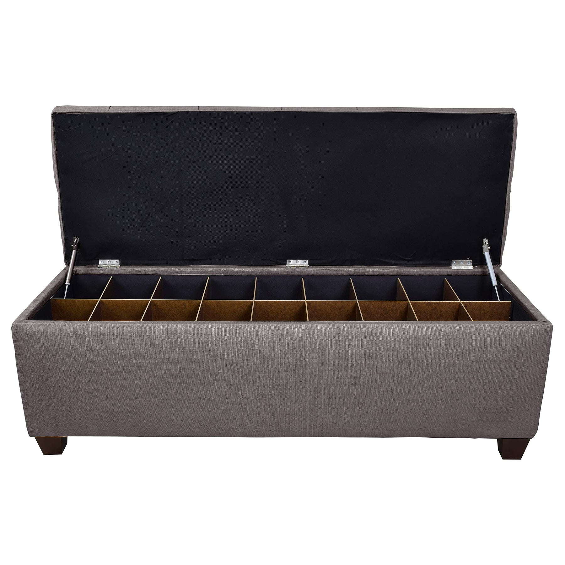 Transform your home with The Sole Secret Living Room or Bedroom Bench with Storage, a perfect blend of style and practicality. This upholstered shoe bench with storage is an ideal addition to any bedroom, serving as a chic end of bed bench that doubles as a bedroom storage solution. Designed to eliminate clutter, this bedroom bench features 14 to 18 removable shoe slots, perfect for organizing footwear, handbags, or miscellaneous items. Each insert can hold up to Men's Size 12 or Woman's Size 14 comfortably. Its elegant design and medium comfort level make it a versatile piece for any room, including the living room or mudroom.As an entryway bench with shoe storage, it offers a welcoming touch while keeping your space tidy. The sturdy construction and luxurious upholstery ensure that this indoor bench is both a functional piece of furniture and a stylish accent to your home decor. Whether you need an end of bed storage bench or a practical mudroom bench with shoe storage, this bench provides the perfect solution. Its easily removable dividers allow for customization, transforming it into a blanket chest or toy storage as needed.The Sole Secret storage bench is more than just space saving furniture; it’s an artisan-crafted, American-made gem that fits seamlessly into any home. Elevate your home organization with the Sole Secret - where fashion meets function.