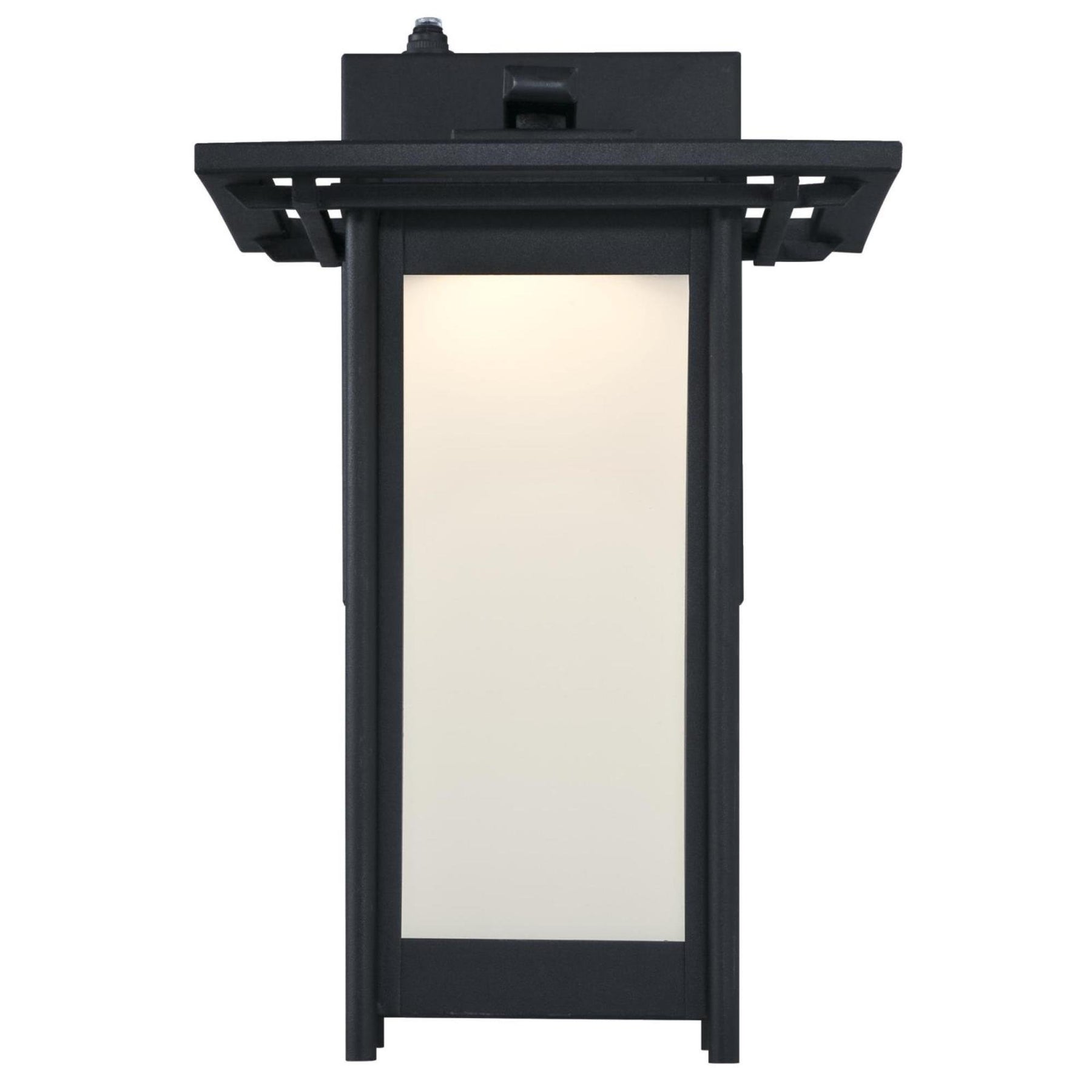 Energy-saving, one-light outdoor wall fixture with dusk to dawn feature complements a variety of home styles | Outdoor rated fixture with textured black finish and frosted glass creates an arts and crafts look | Integrated 12.5-watt dimmable LED is equivalent to 1-60-watt incandescent bulb, 2700K-warm white light, no bulbs to replace | Height 11-1/4 inches, Width 7 inches, Extends from wall 8-3/4 inches, 3-1/8 inches height from center of outlet box, back plate 6-5/16 inches in height, back plate 4-9/16 inches in width | Includes installation instructions and mounting hardware, ETL/CETL listed