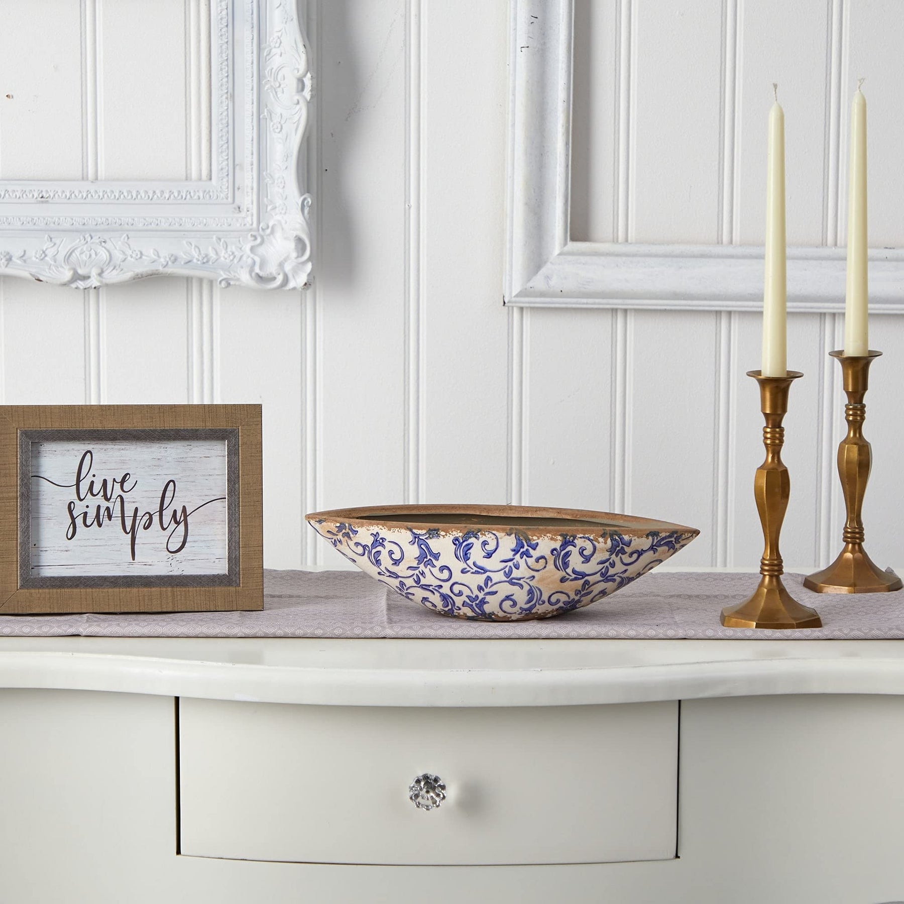 13" Tuscan Ceramic Blue Scroll Decorative Bowl White Traditional