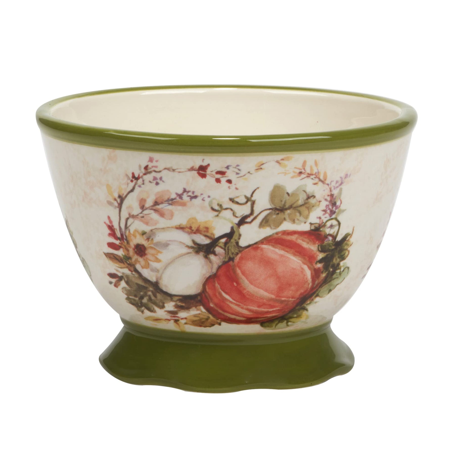 Celebrate Thanksgiving and Fall with Certified International’s bright and colorful "Harvest Morning" Set of 4 Ice Cream Bowls designed by the popular artist Susan Winget . Beautiful watercolor pumpkins and gourds with flowers in 4 assorted designs decorate each footed bowl. Each set includes 4 - 5.25 in. Dia. X 3.625 in. High bowls. Great for ice cream, cereal, soup and snacks. Coordinating dinners, desserts, mugs, serveware and 3-d accessories are available to set your wonderful Thanksgiving and Fall table.