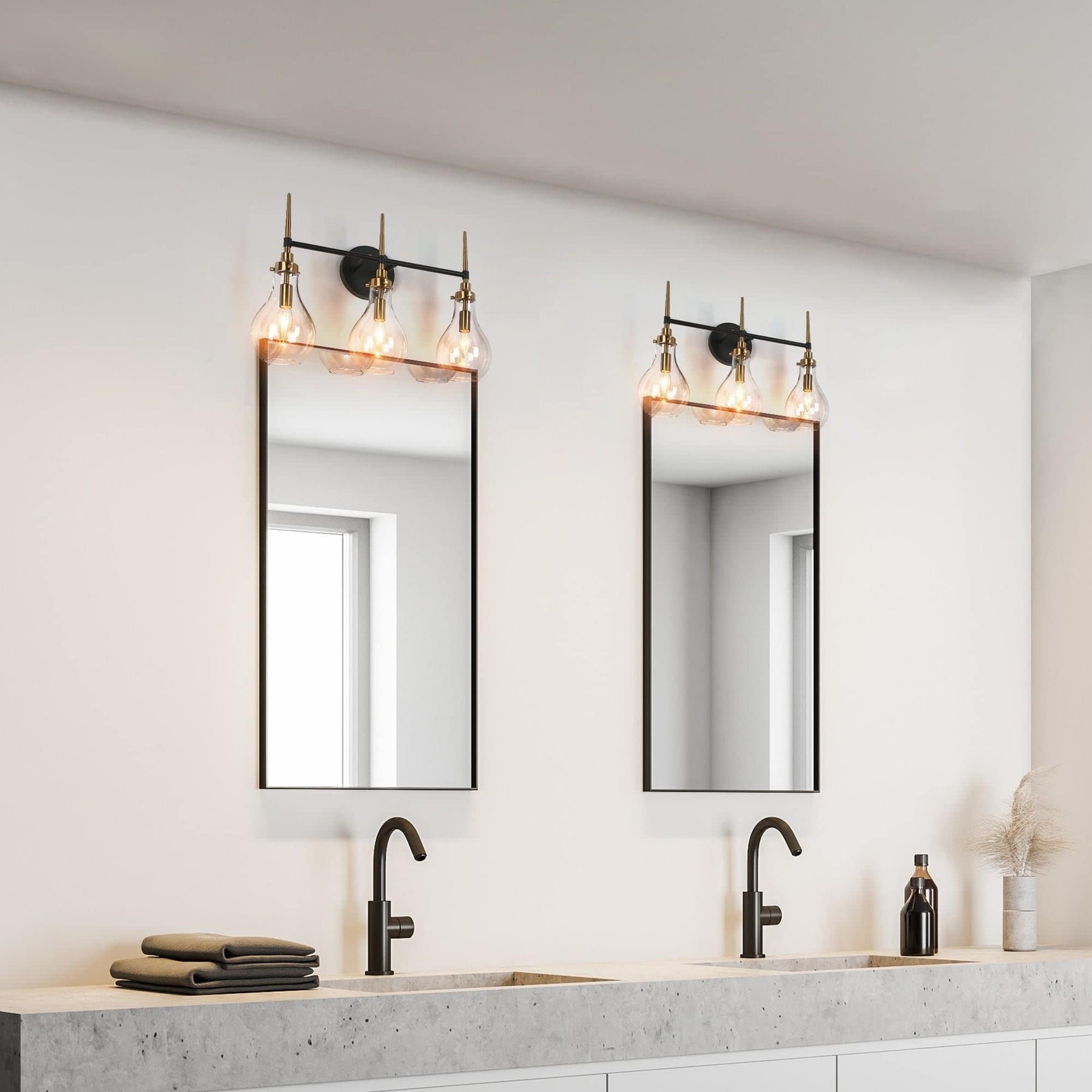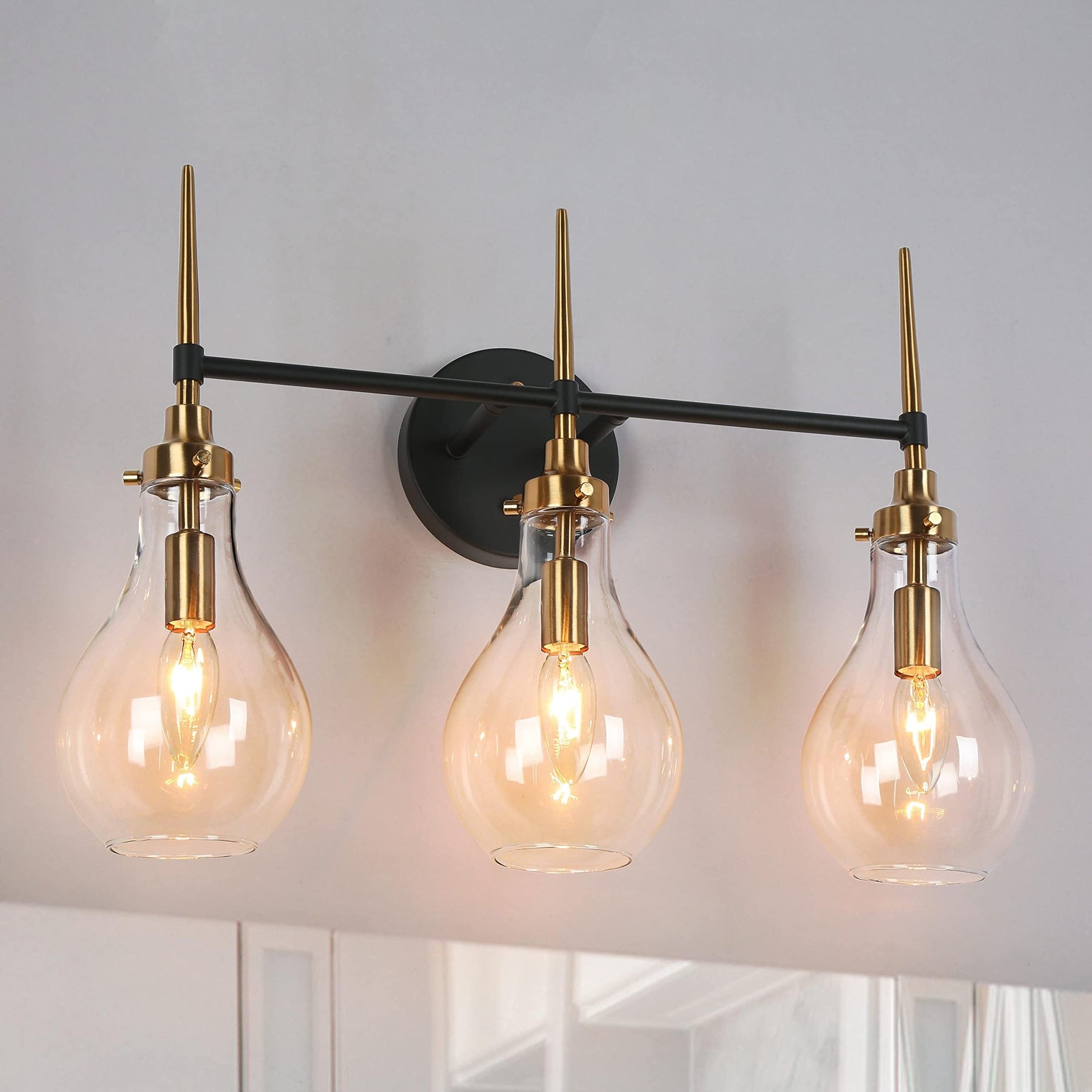 Globe 3-light Bathroom Vanity Lights Tear Drop Wall Lamp L 21.6" X W 7.1" H 14.5" Black Gold Glam Transitional Glass Iron Metal | Overall size: L 21.6" x W 7.1" x H 14.5". Glass shade: D5'' x H7.8''/ ea. Canopy: D5''. Design/Look : Glam, Modern & Contemporary, Transitional. Material : Glass, Iron, Metal. Finish : Black, Gold. Shade material : Glass. Switch type : Dimmer Switch. Assembly : Assembly Required. Color : Black, Gold. Finish enhancements : Polished. Fixture design : Cage, Globe, Linear. Glass type : Clear. Light bulb type : Fluorescent, Incandescent, LED Compatible. Light direction : Downlight | Length : 13 to 24 Inches. Dimmable. Product Size: 21.6 In. L X 7.1 In. W X 14.5 In.