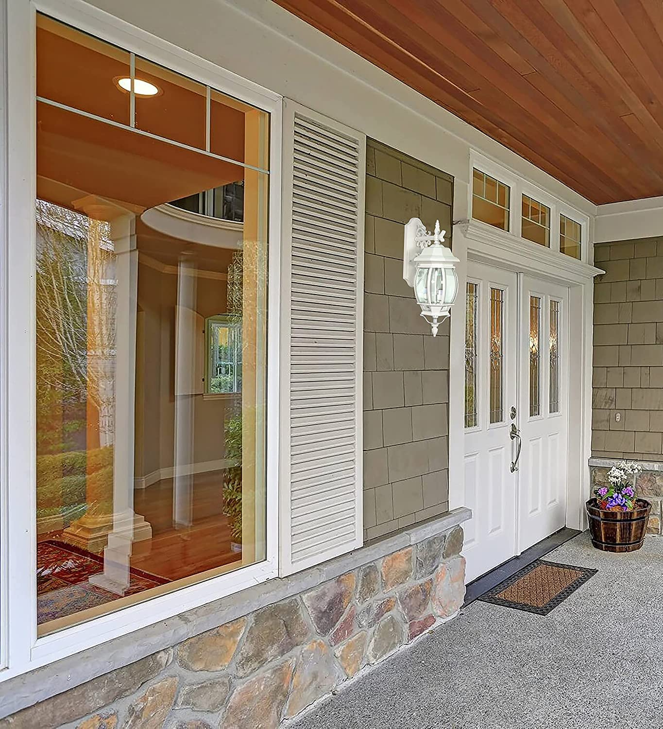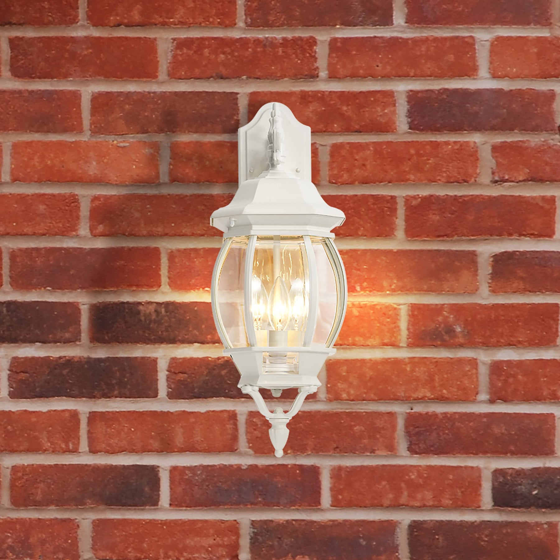 3-light 22" outdoor wall lantern with clear beveled glass, in a white finish | Max 60 watts and 120 volts, and uses (3) Type B Light bulbs with E12 base; bulb(s) not included | Made from die-cast aluminum, the lantern is rated for wet locations and is cULus listed | Mount to the wall to illuminate your front door, porch, gazebo, patio, and other exterior spaces | Includes a 1-year limited manufacturer warranty