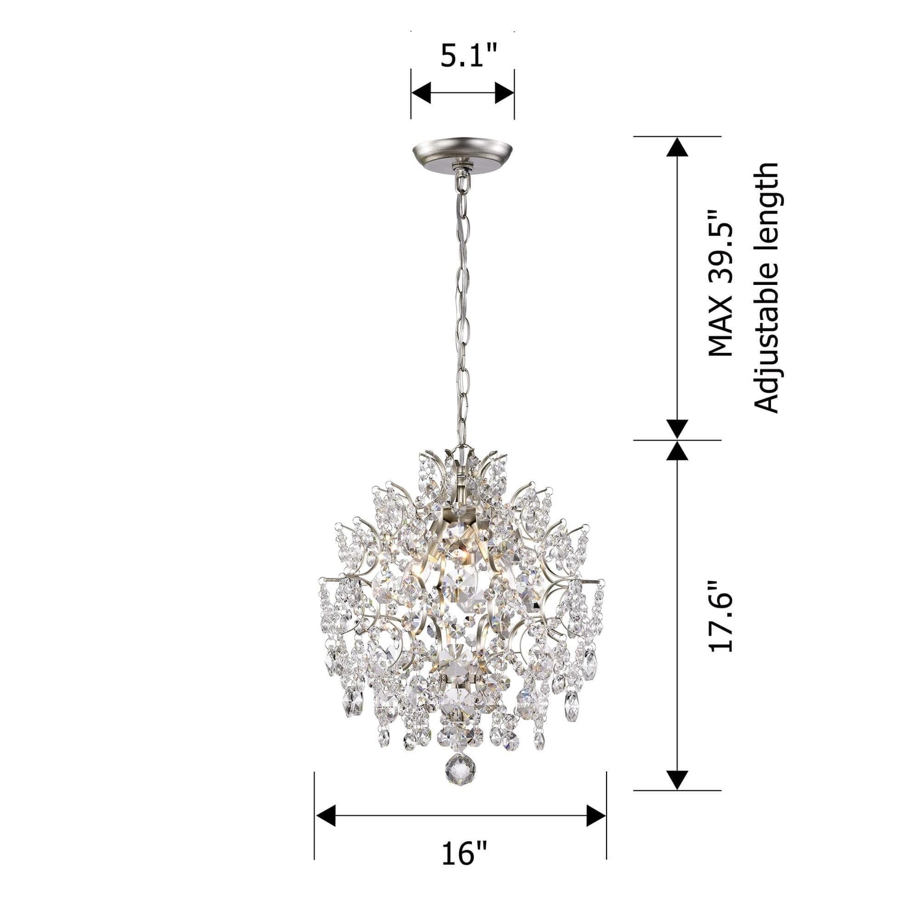Features: Made of durable iron and glass materials, Requires three 40-watt E12 light bulbs (not included) | Compatible with candelabra, incandescent, halogen, or LED bulbs, Available in 2 finish options: 1. Brushed Champagne Silver finish combines champagne and silver tones with a touch of brown. 2. Brushed Brass. | Weighs 8.1 lbs, Dimensions: Fixture measures 16 inches in diameter x 17.5 inches tall | Comes with a 39.4-inch chain that can be shortened, Max hanging height (from ceiling to the bottom of the light fixture) is 57.1 inches, which can be shortened. | Assembly is required to install the chandelier.