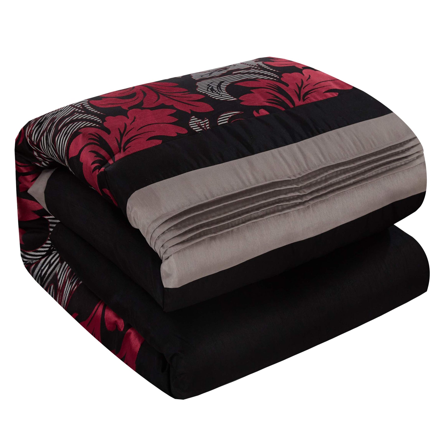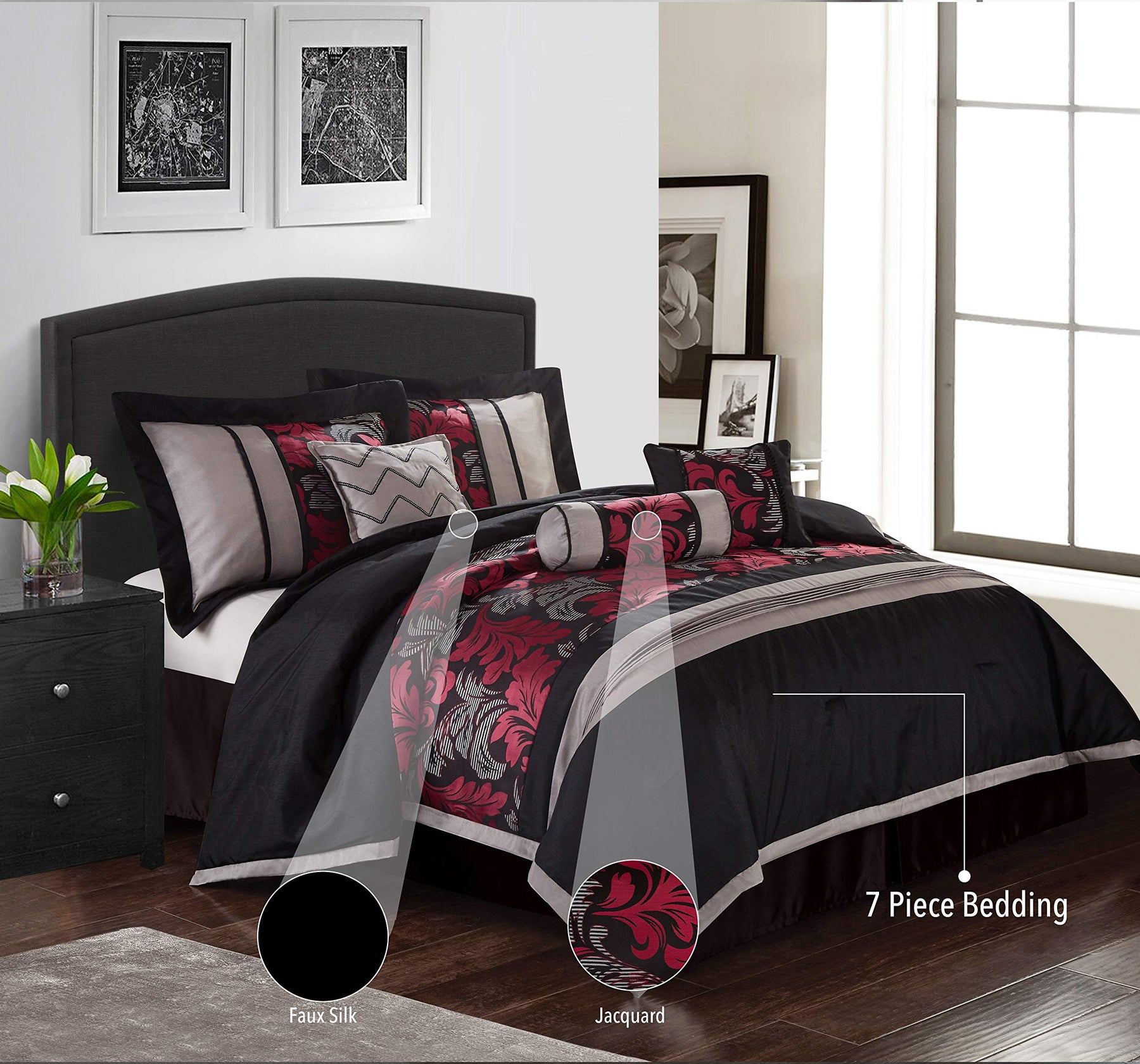 Achieve that lasting luxurious flair to your bed with this Lincoln Comforter Set, featuring seven pieces for a complete ensemble. The California king size comforter measures 101" L in. x 86" W in. with a 1.5-inch thickness for insulating comfort. The two standard pillow shams measure 37" L in. x 21" W in. There are three decorative pillows measuring 16" L in. x 16" W in., 12" L in. x 16" W in., and 16" L in. x 6.5" W in. There is an included bed skirt measuring 72" L in. x 84" W in. with a 14-inch drop that covers the base of the bed. The comforter and the rest of the items feature 100% polyester fabric and polyester fill for total insulation and comfort.A gorgeous set featuring bright red and gold floral design on a background of black and gray.At Nanshing, we sought to blend artistry and design. By making fantastic designs and stunning combinations, we create fine bedroom textiles that offers great value for your home.