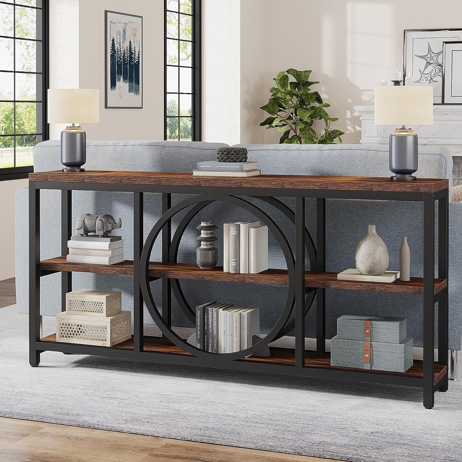 70.9 Inch Extra Long Console Table with 3 Tier Wood Storage Shelves Black Rustic Brown