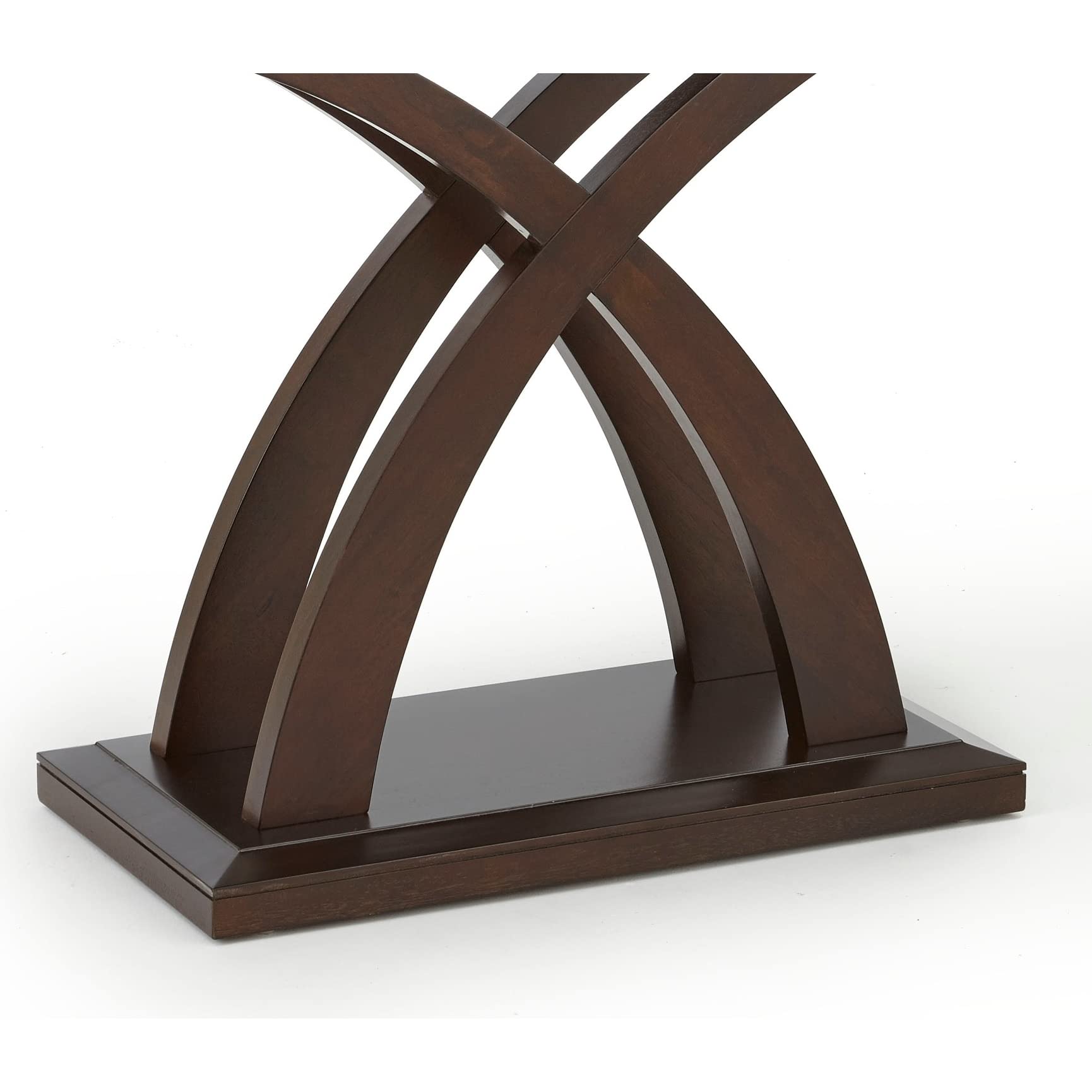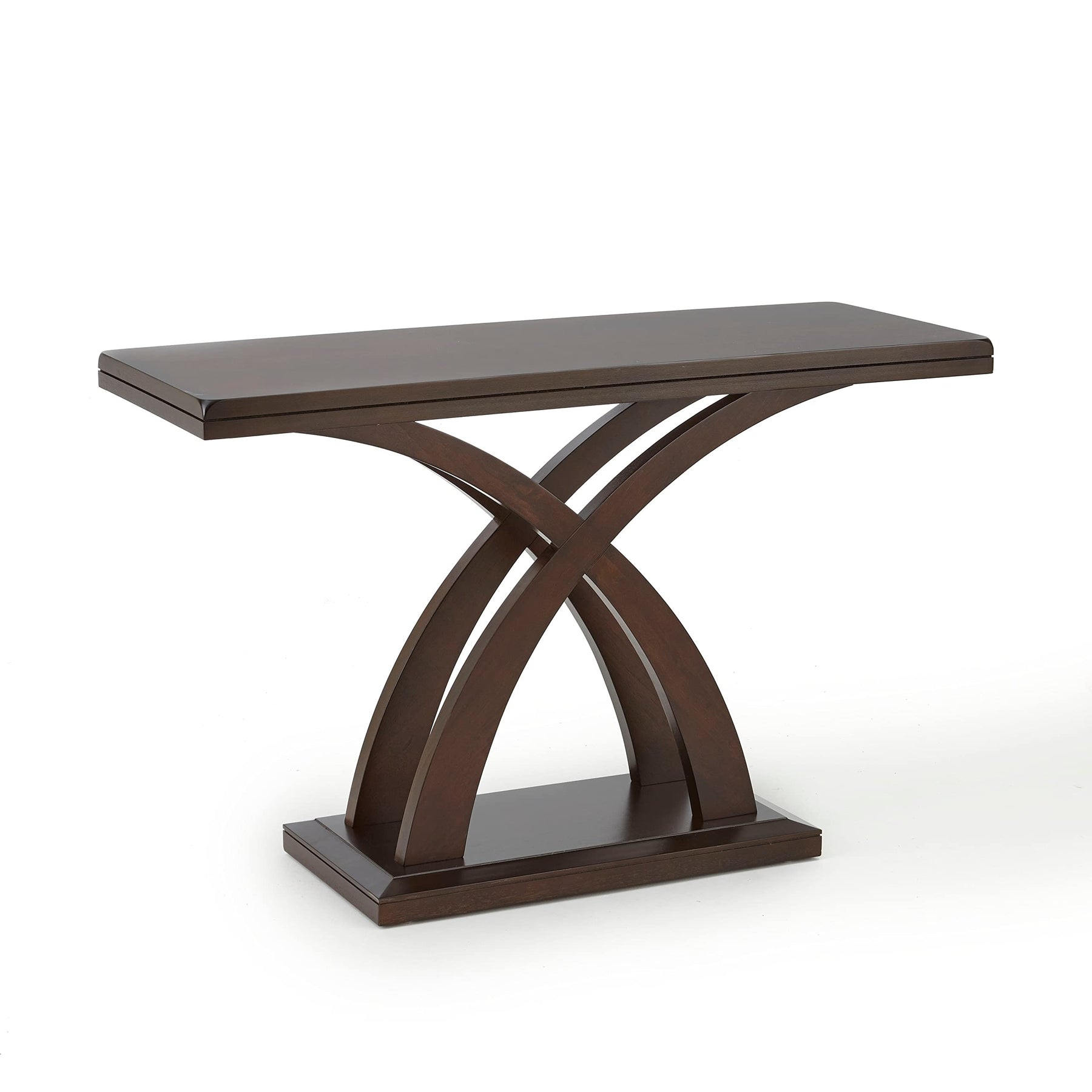 Make a bold statement with the transitionally styled Avellino sofa table. The unique curvy X-style pedestal base and thick, double edge top finished in espresso cherry will add finesse to your living area.Material: Hardwood Solids, VeneersFinish: Espresso CherryIncludes (1) sofa tableTransitional StyleDesigner, curvy X-style pedestal base adds a modern flareThick, double edge top for stabilityRich espresso cherry finish will complement many decorsSofa Table Dimensions: 30 inches high x 48 inches wide x 18 inches deepAssembly required. This product ships in one (1) boxAccessories are NOT included