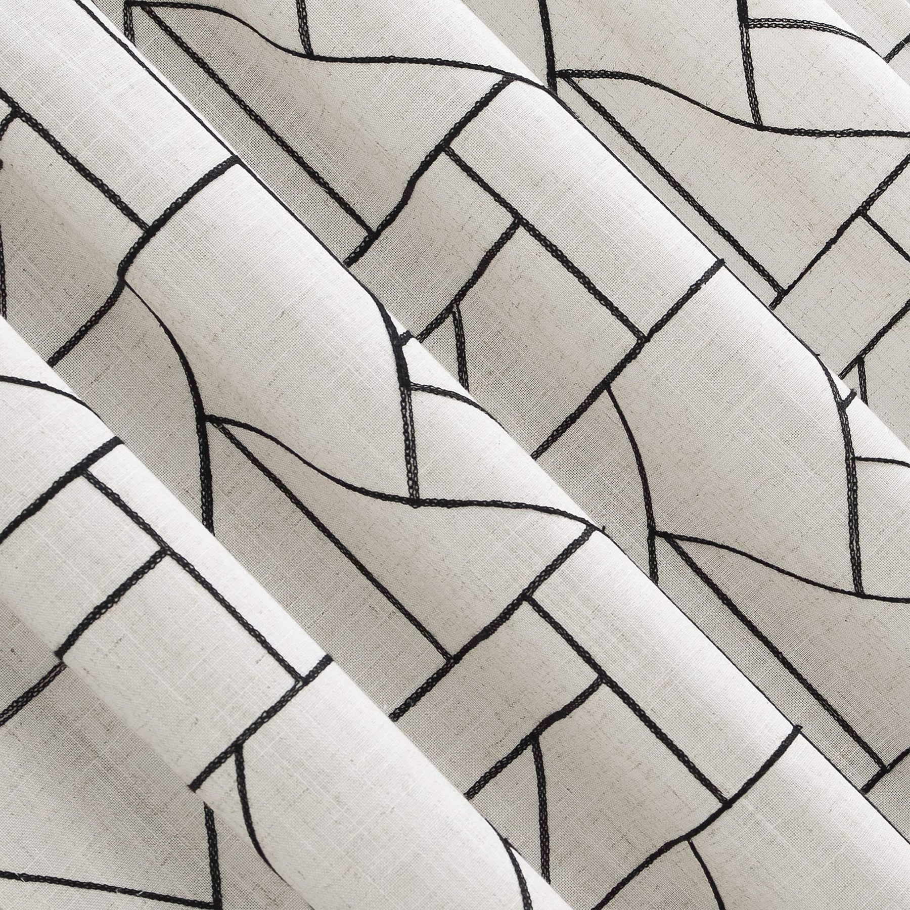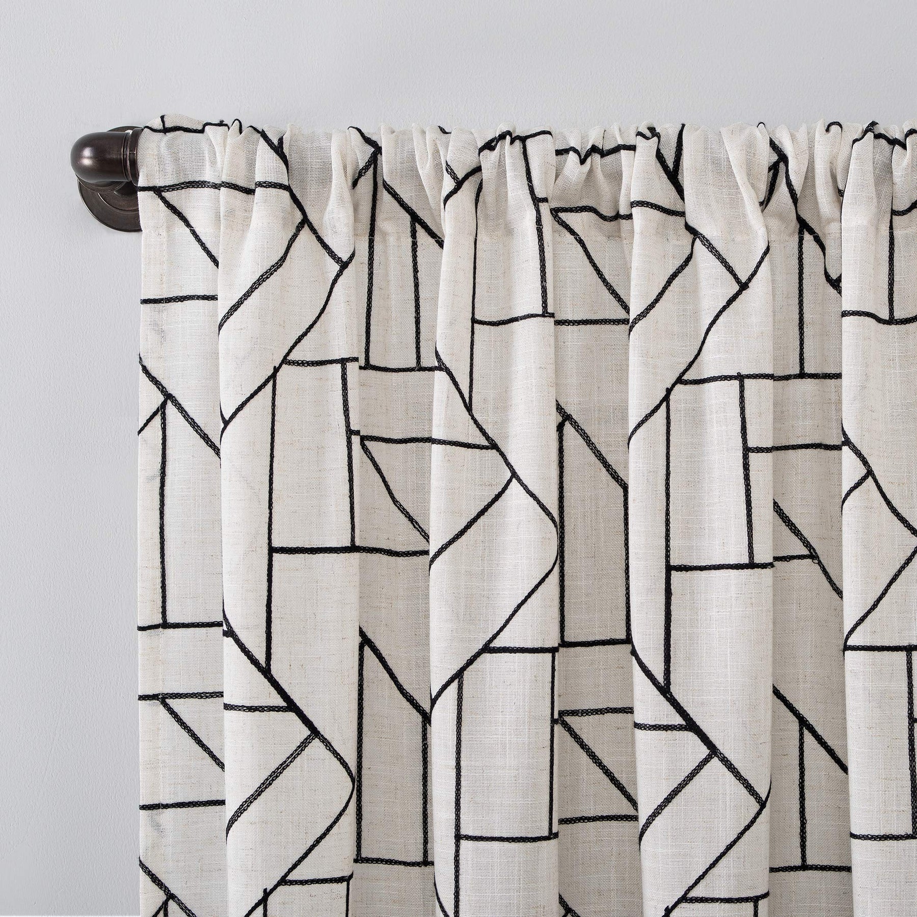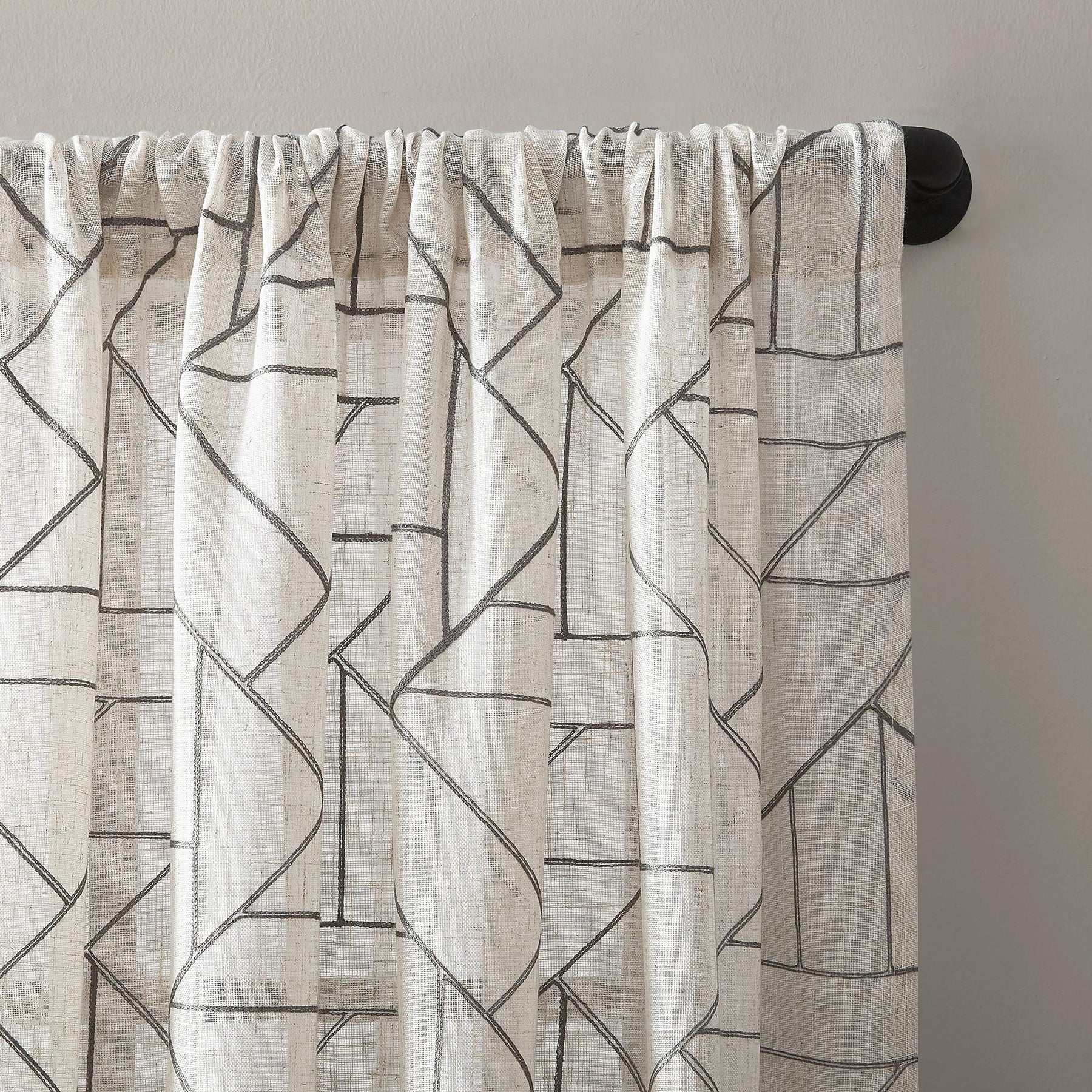 Abstract design and modern glam merge to create the Natural Linen Blend Curtain from Archaeo. A perfect complement to mid-century modern decor, this airy weave linen blend curtain brings enviable texture and dimension to any room with an intricately embroidered abstract geometric design. The semi-sheer linen blend fabric gently filters light while enhancing privacy. Pole top rod pocket design allows for simple slide-through installation on curtain rods up to 1 ½" in diameter. Sold as individual panels measuring 50" width by 108" length in color black/linen. Measure carefully before selecting your desired size and quantity. Rod not included. Machine wash cold on gentle cycle. Use non-chlorine bleach when needed. Tumble dry on low heat, using a cool iron as needed.