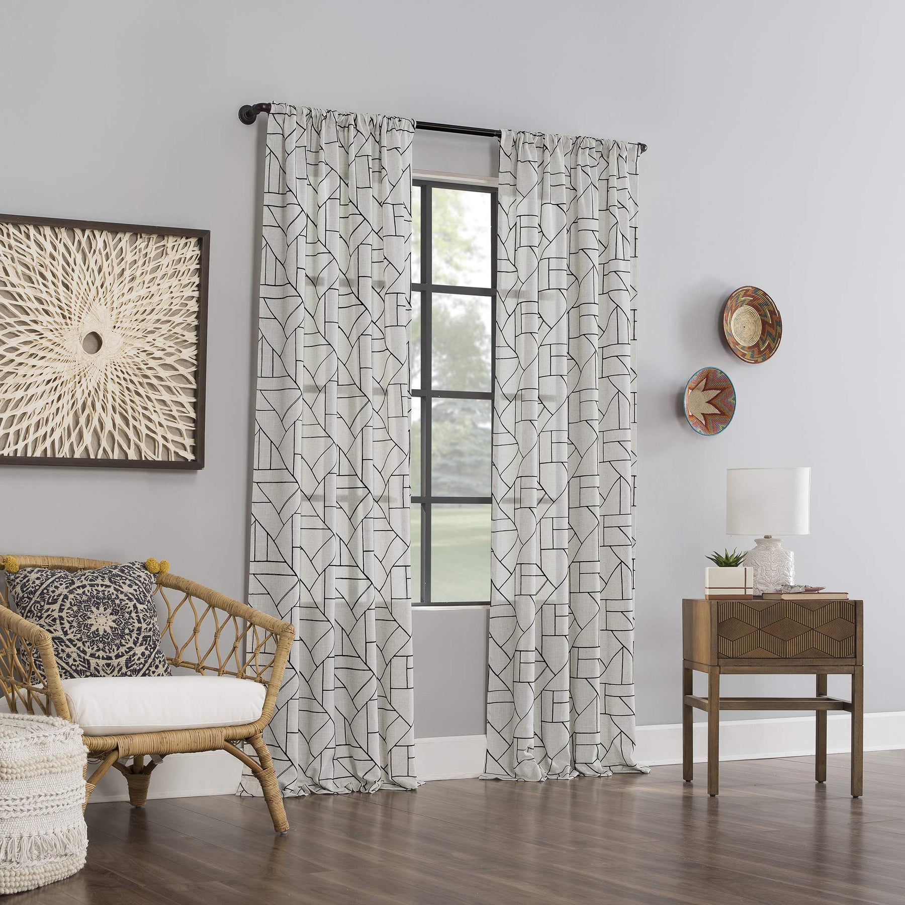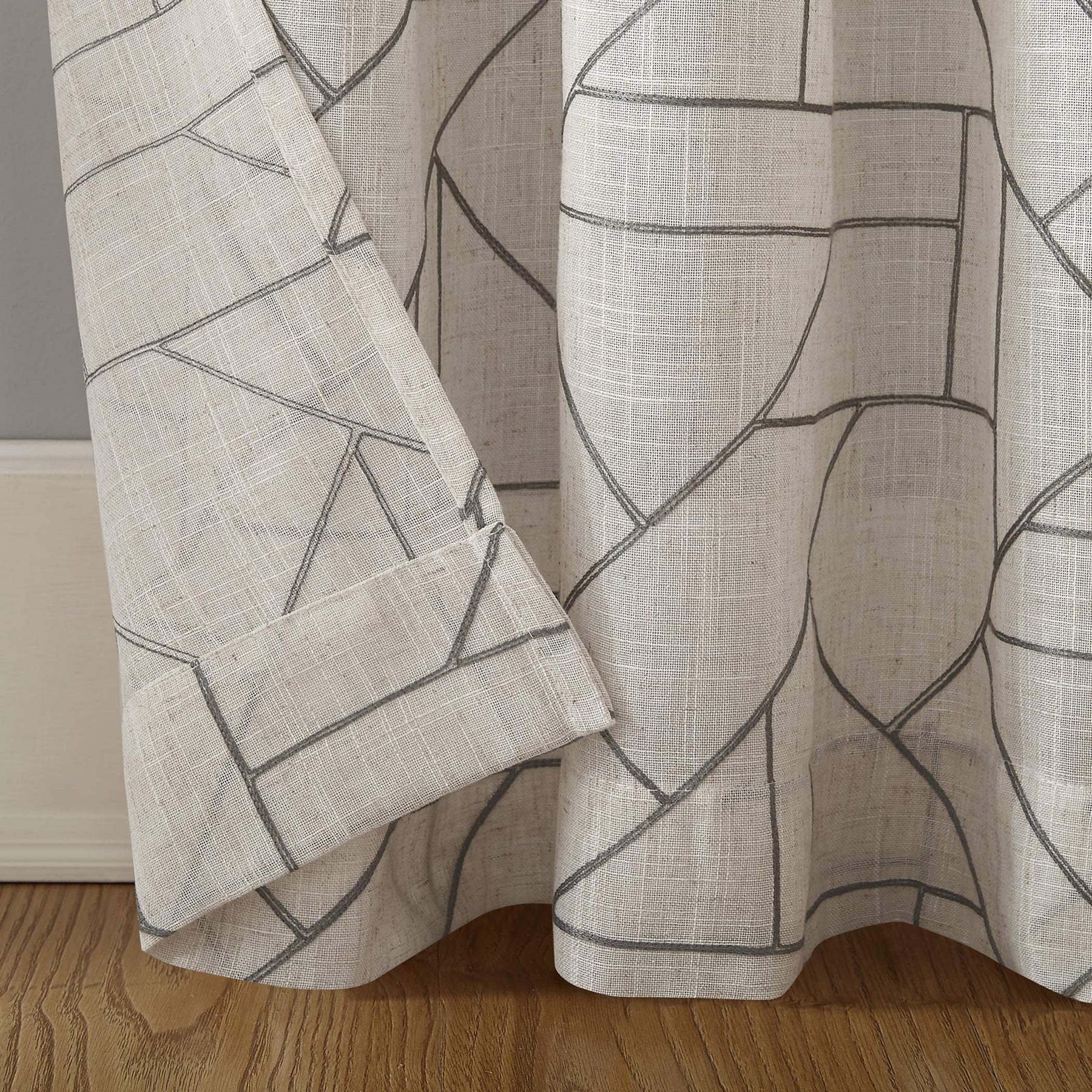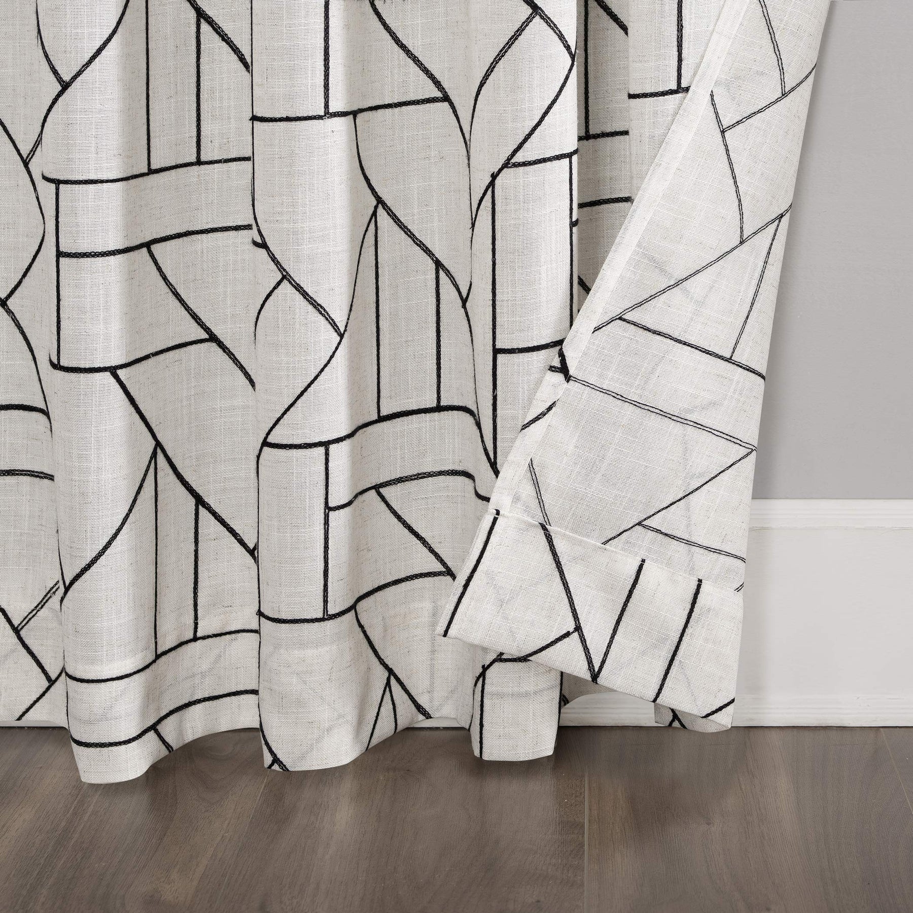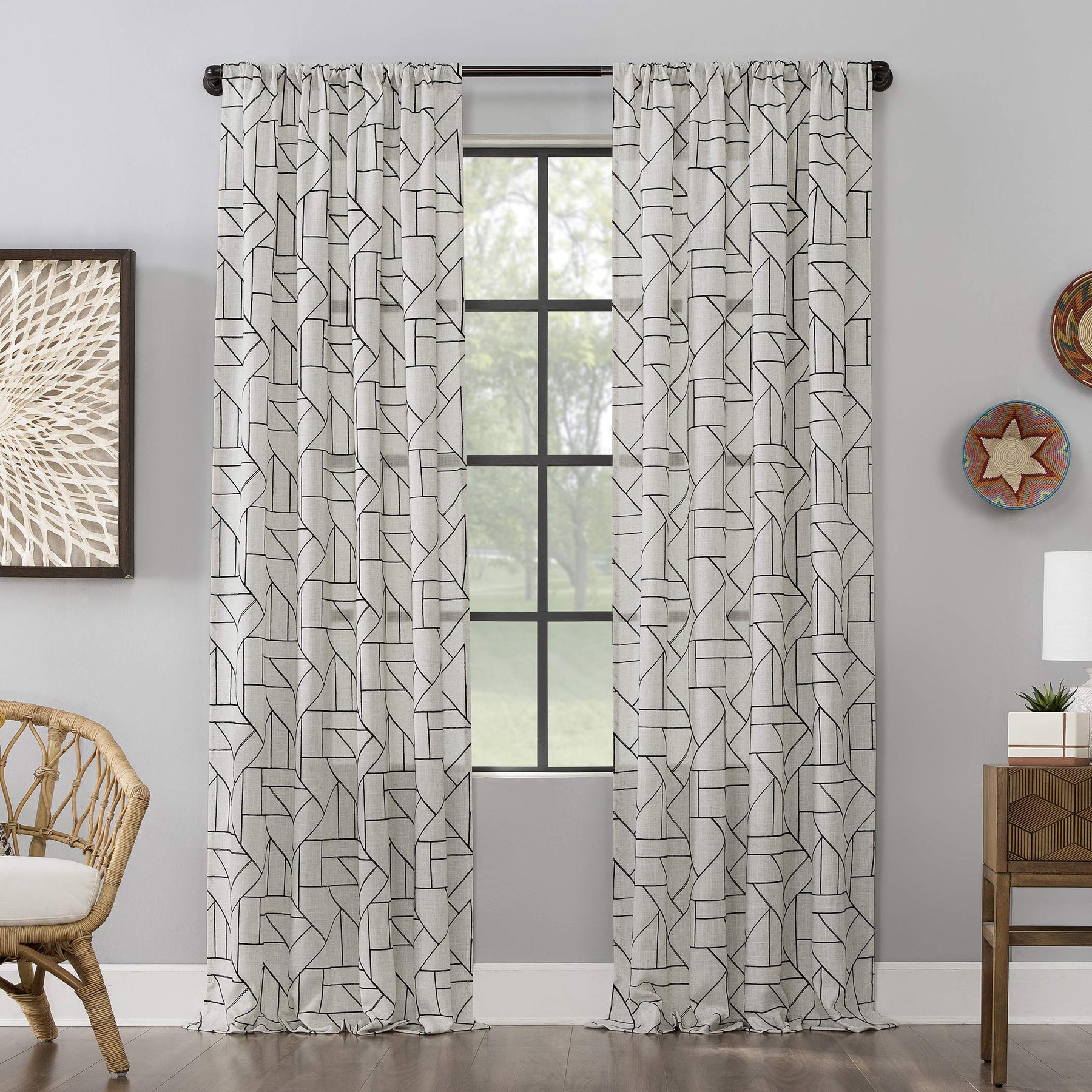 Abstract design and modern glam merge to create the Natural Linen Blend Curtain from Archaeo. A perfect complement to mid-century modern decor, this airy weave linen blend curtain brings enviable texture and dimension to any room with an intricately embroidered abstract geometric design. The semi-sheer linen blend fabric gently filters light while enhancing privacy. Pole top rod pocket design allows for simple slide-through installation on curtain rods up to 1 ½" in diameter. Sold as individual panels measuring 50" width by 108" length in color black/linen. Measure carefully before selecting your desired size and quantity. Rod not included. Machine wash cold on gentle cycle. Use non-chlorine bleach when needed. Tumble dry on low heat, using a cool iron as needed.