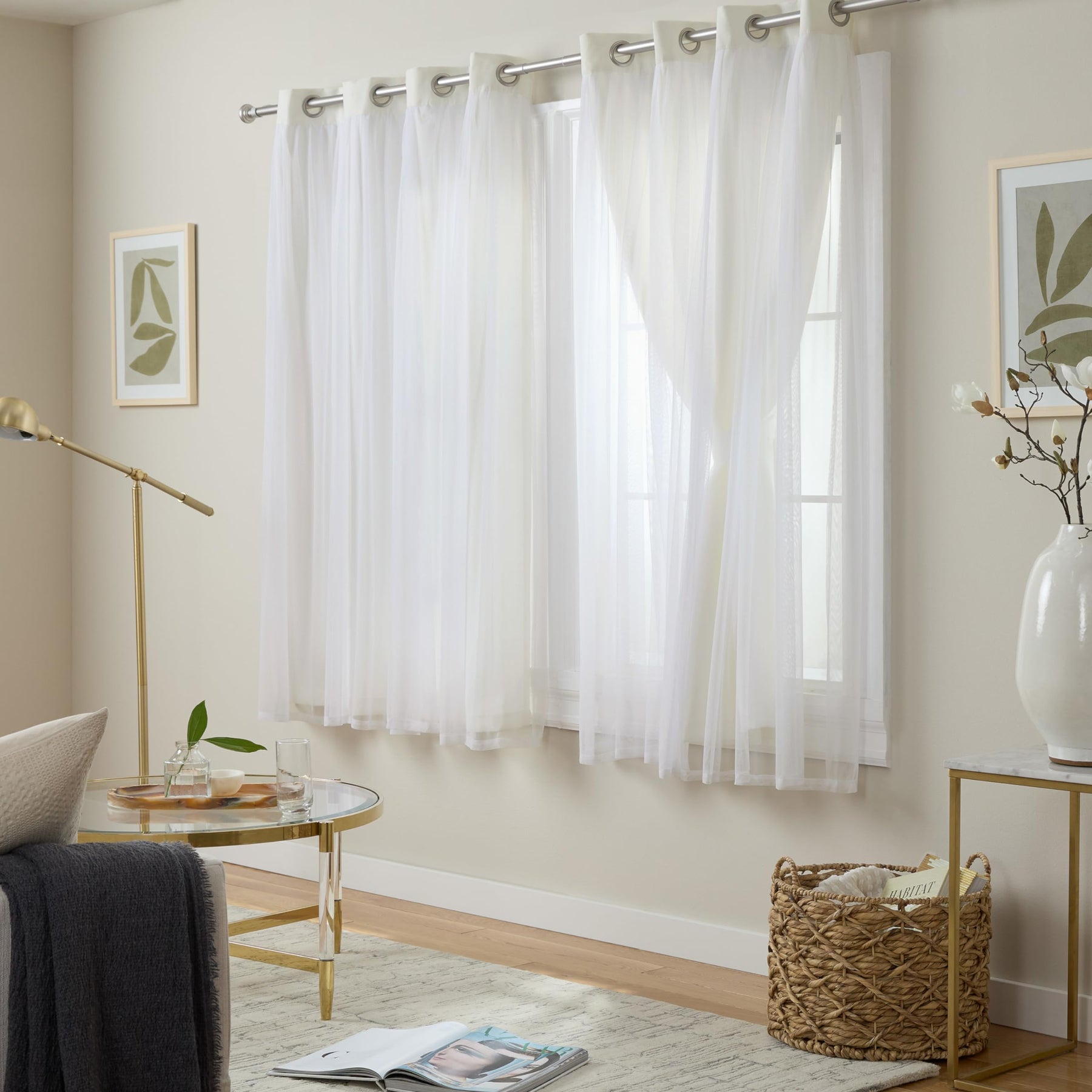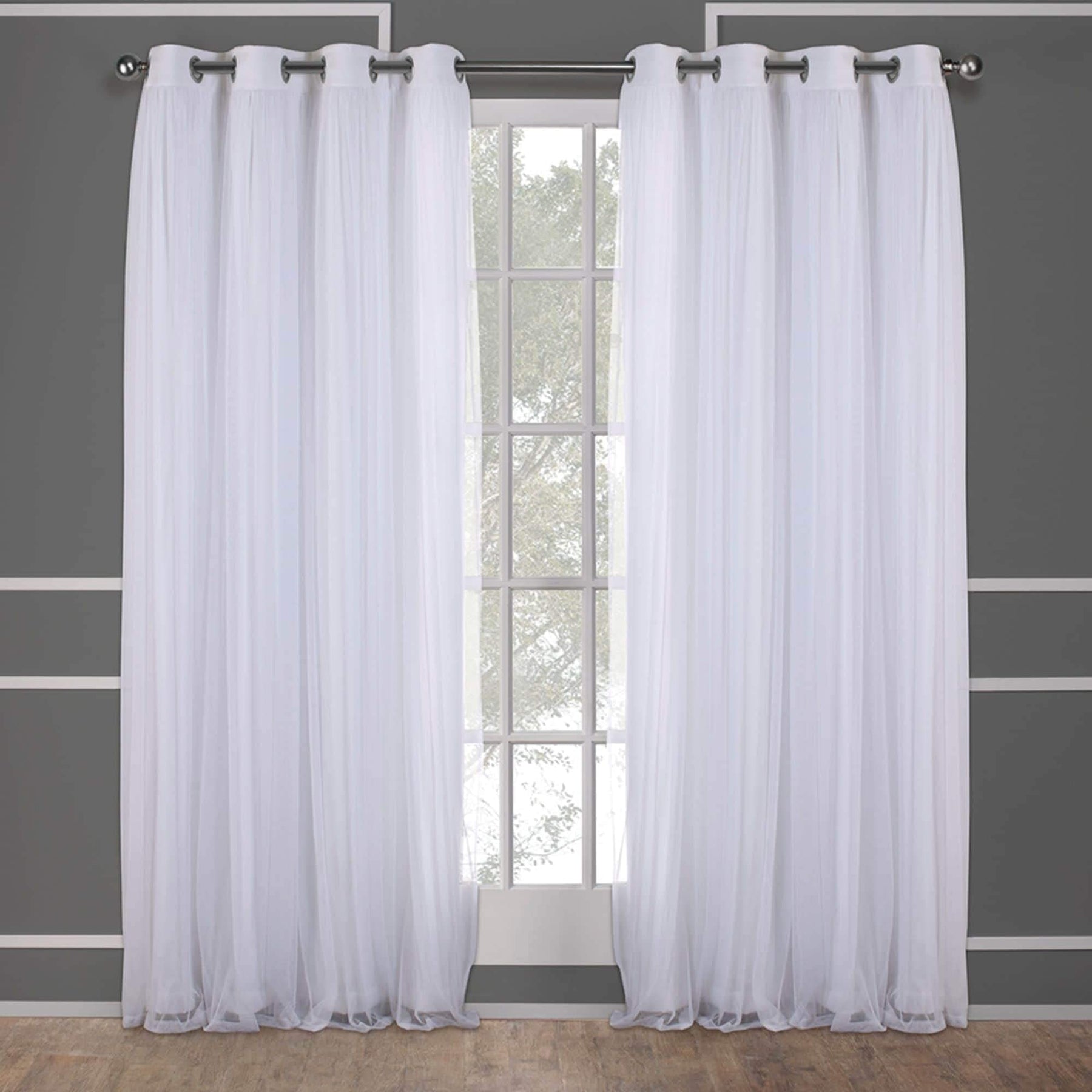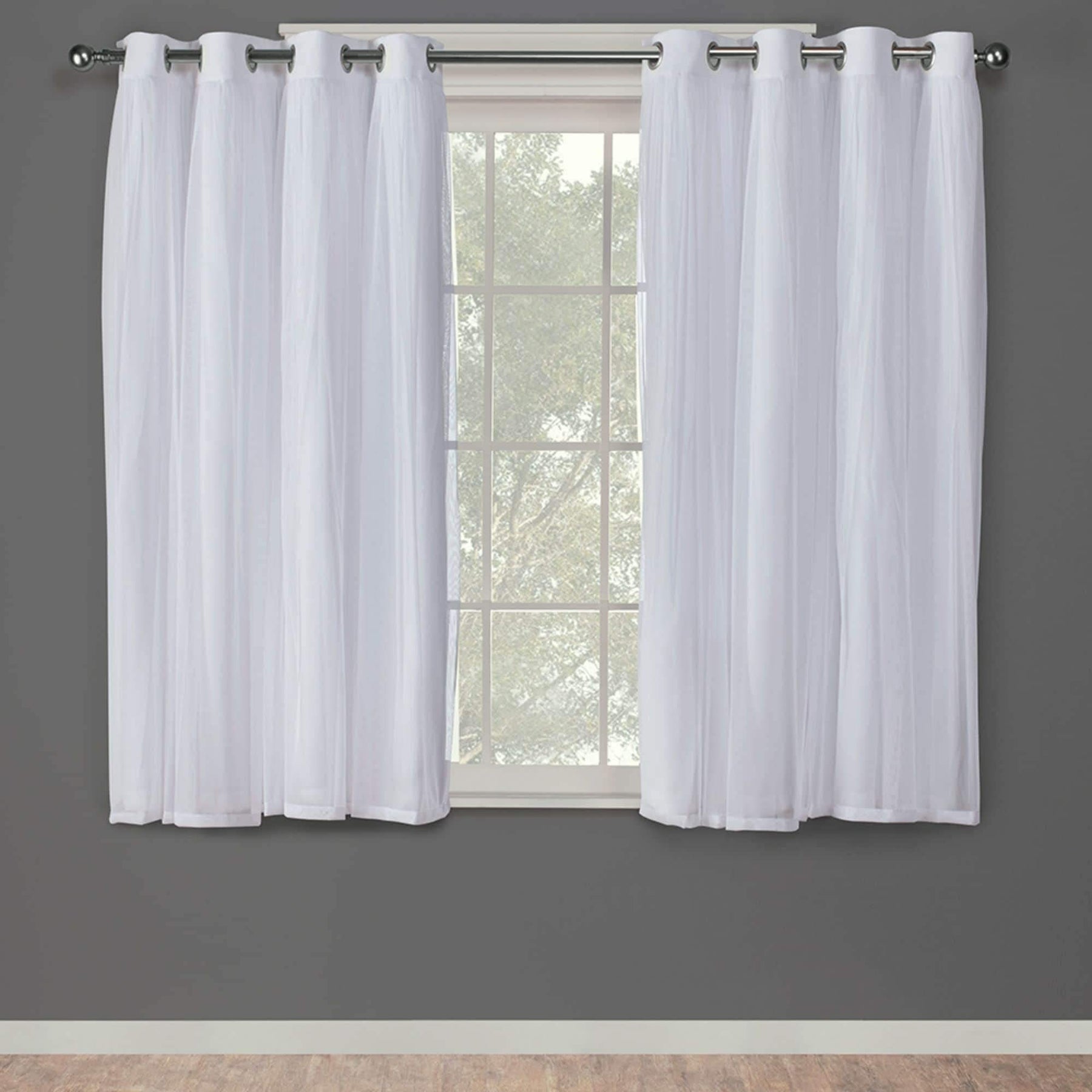 Talia Double Layer Sheer and Room Darkening Blackout Indoor Curtains 2-Pack | Includes two (2) curtain panels, each measuring 52"W x 96"L. | Sheer Opacity allows natural light to flow through the room while Room Darkening Blackout Opacity minimizes exposure to sunlight and allows you to create darkness any time of day | 100% Polyester, with smooth, sateen look | Grommet top treatment with eight (8) matte silver grommets | Woven with thermal insulation and light blocking fibers | Hand wash cold with like colors. Only non-chlorine bleach, as needed. Line dry. Cool iron.