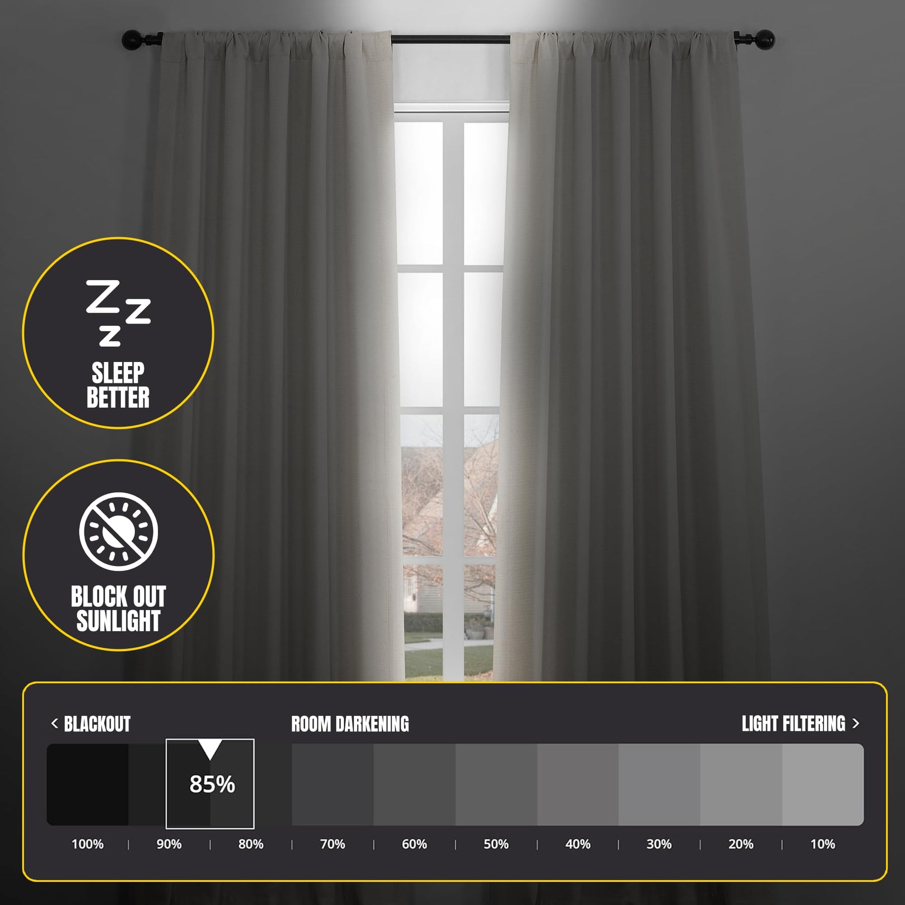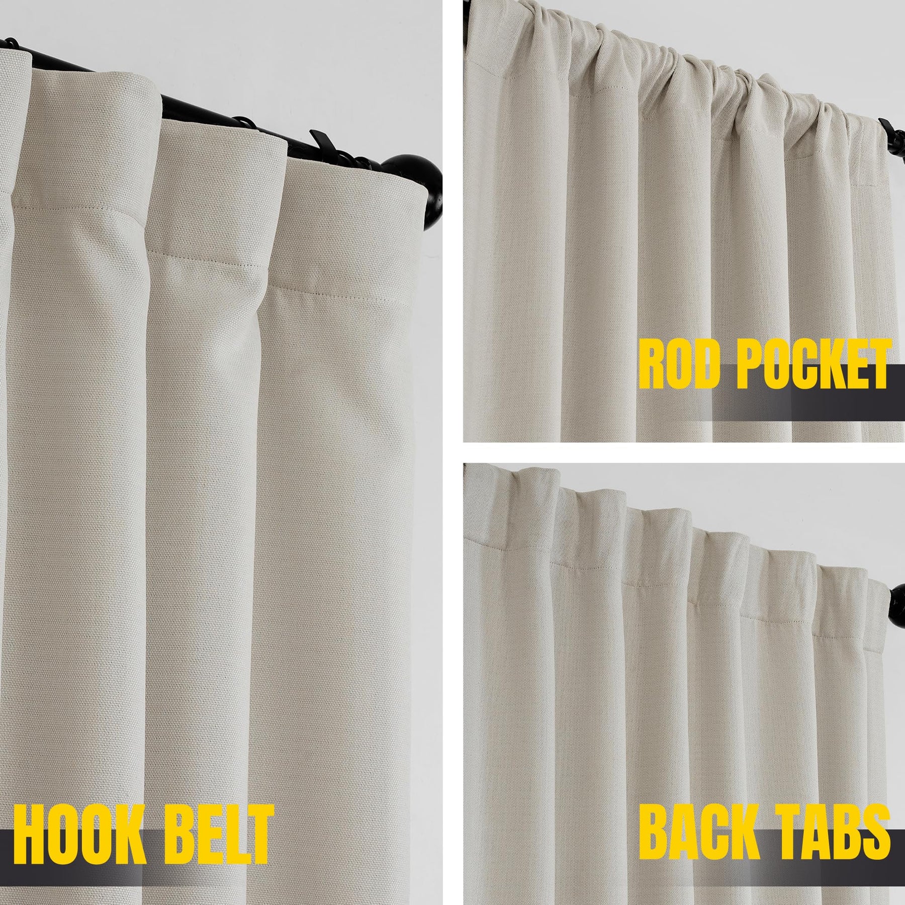 Linen | LIGHT CONTROL - This unlined curtain panel is considered Room Darkening, blocking anywhere from 80-85% of the light. Darker colors will always block more of the light while lighter colors let more of the light through | SOLD PER PANEL - Once purchased you will receive ONE PANEL (1), measuring 50 inches (127 cm) wide by 108 inches (274.32 cm) in length. Each panel will be individually bagged to preserve the fabric quality. See below for the measuring guide | HOW TO HANG - Our most versatile header allows you to hang 3 ways. Curtain panels can be sheered on a rod using the pocket, Hang with back tabs for a fixed ripple look or attached to rings using the belt and drapery pins, Hooks Not Included | COLOR & TEXTURE - This Oatmeal Color with Linen Texture is a perfect choice for your home decor. This curtain is unlined and has a weighted hem at the bottom | KEEP IT CLEAN - The curtains should be dry cleaned only. Fold lines can be steamed out using a iron or garment steamer. Avoid making contact with the face fabric. Image Disclaimer: The digital images we display have the most accurate color possible. However, due to differences in computer monitors, we cannot be responsible for variations in color between the actual product and your screen.