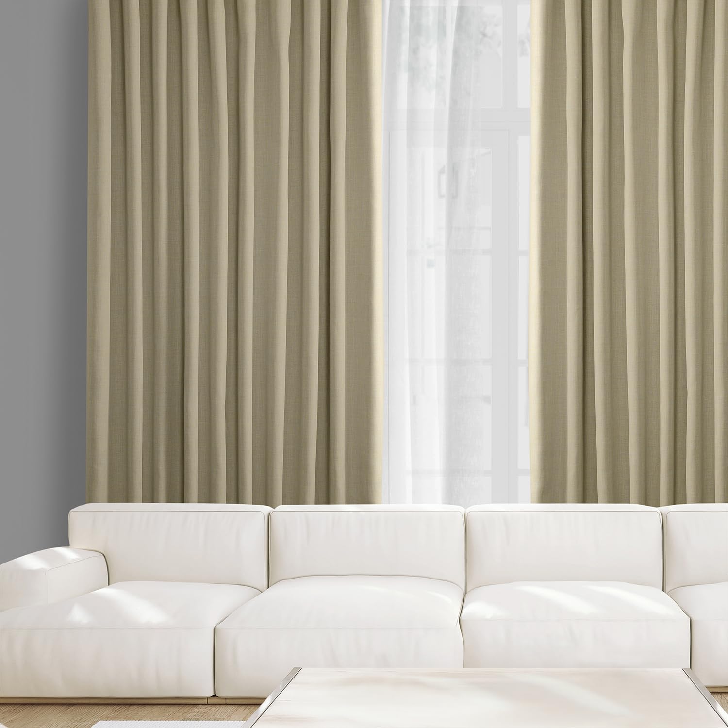 LIGHT CONTROL - This unlined curtain panel is considered Room Darkening, blocking anywhere from 80-85% of the light. Darker colors will always block more of the light while lighter colors let more of the light through. | SOLD PER PANEL - Once purchased you will receive ONE PANEL (1), measuring 100 inches (254 cm) wide by 108 inches (274.32 cm) in length. Each panel will be individually bagged to preserve the fabric quality. See below for the measuring guide. | HOW TO HANG - Our most versatile header allows you to hang 3 ways. Curtain panels can be sheered on a rod using the pocket, Hang with back tabs for a fixed ripple look or attached to rings using the belt and drapery pins, Hooks Not Included. | COLOR & TEXTURE - This Thatched Tan Color with Linen Texture is a perfect choice for your home decor. This curtain is unlined and has a weighted hem at the bottom. | KEEP IT CLEAN - The curtains should be dry cleaned only. Fold lines can be steamed out using a iron or garment steamer. Avoid making contact with the face fabric. | DESCLAIMER - It is important to note that due to variations in computer monitors, there can be discrepancies in color between the actual product and what appears on your screen.