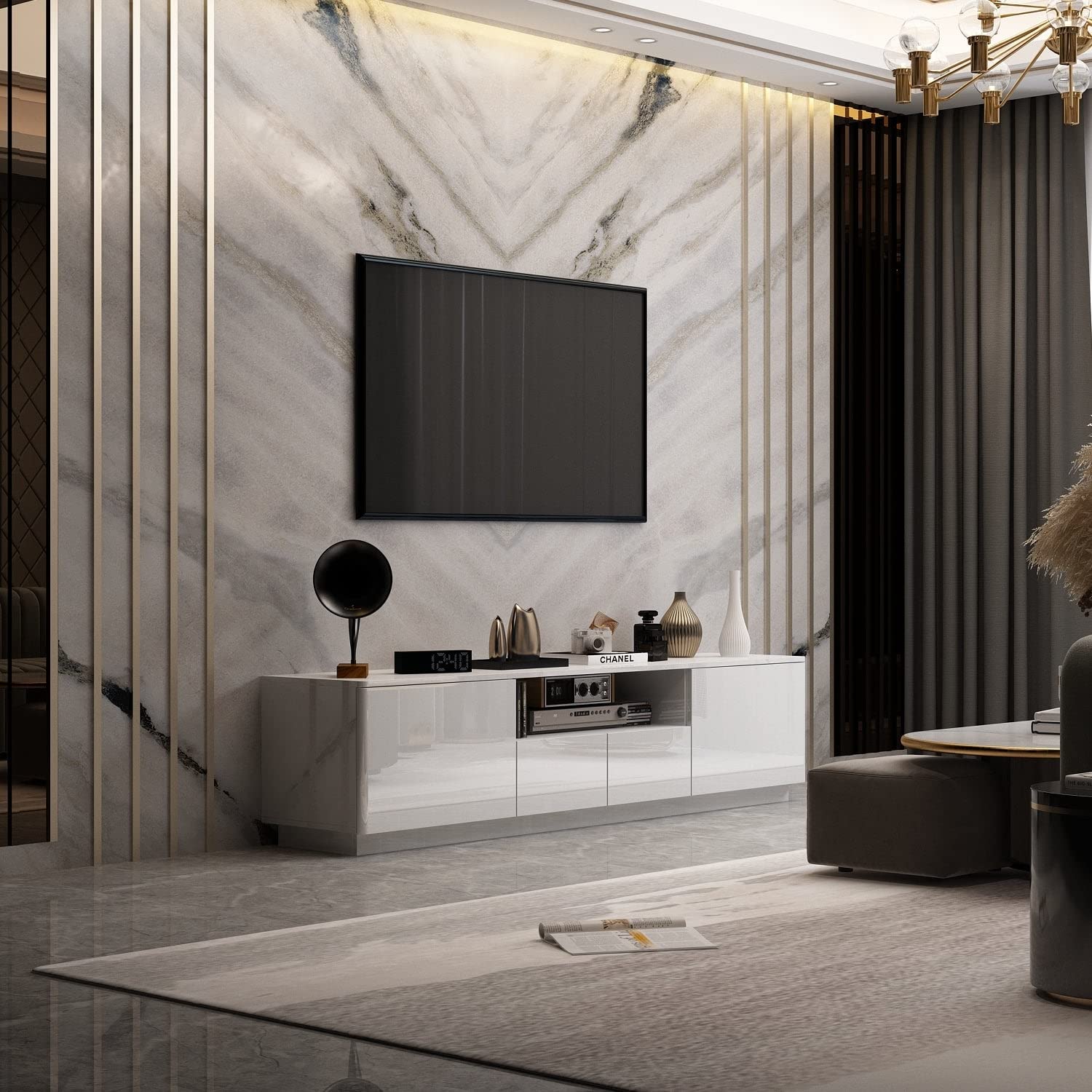 Led Tv Stand Entertainment Center 85" High Gloss Console Cabinet White Bohemian Eclectic Traditional MDF Metal Glossy Matte Drawers