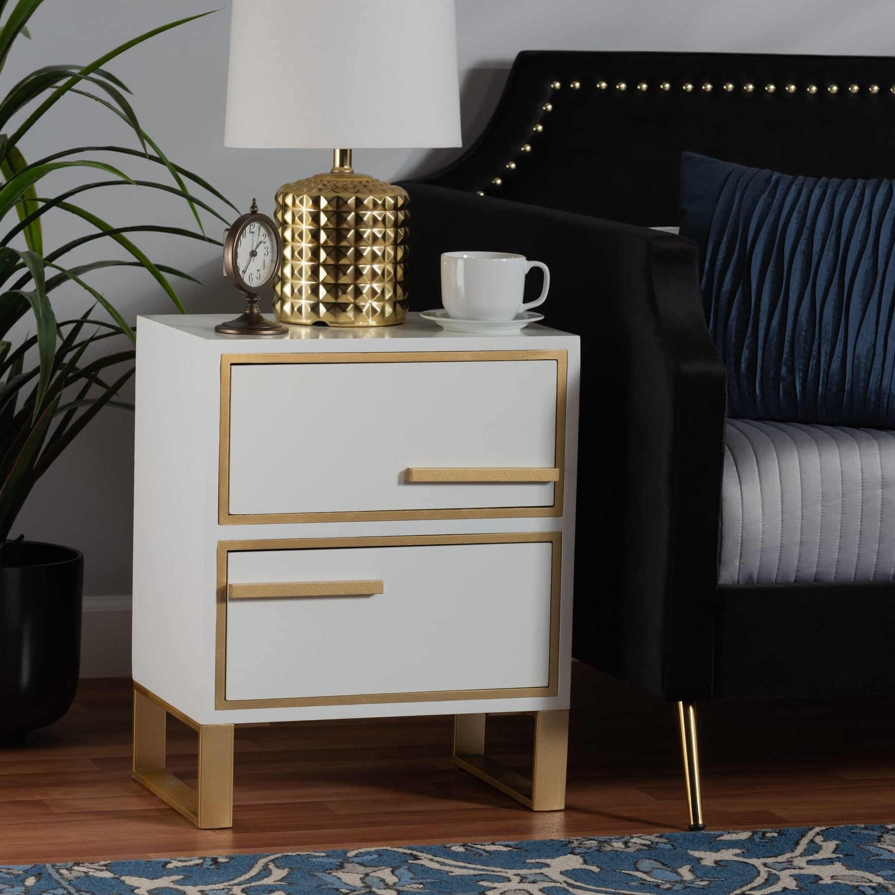 Contemporary Glam and White Finished Wood Gold Metal 2-Drawer Nightstand
