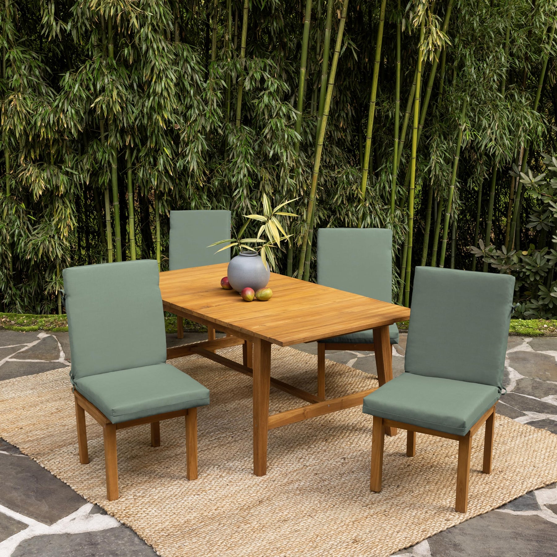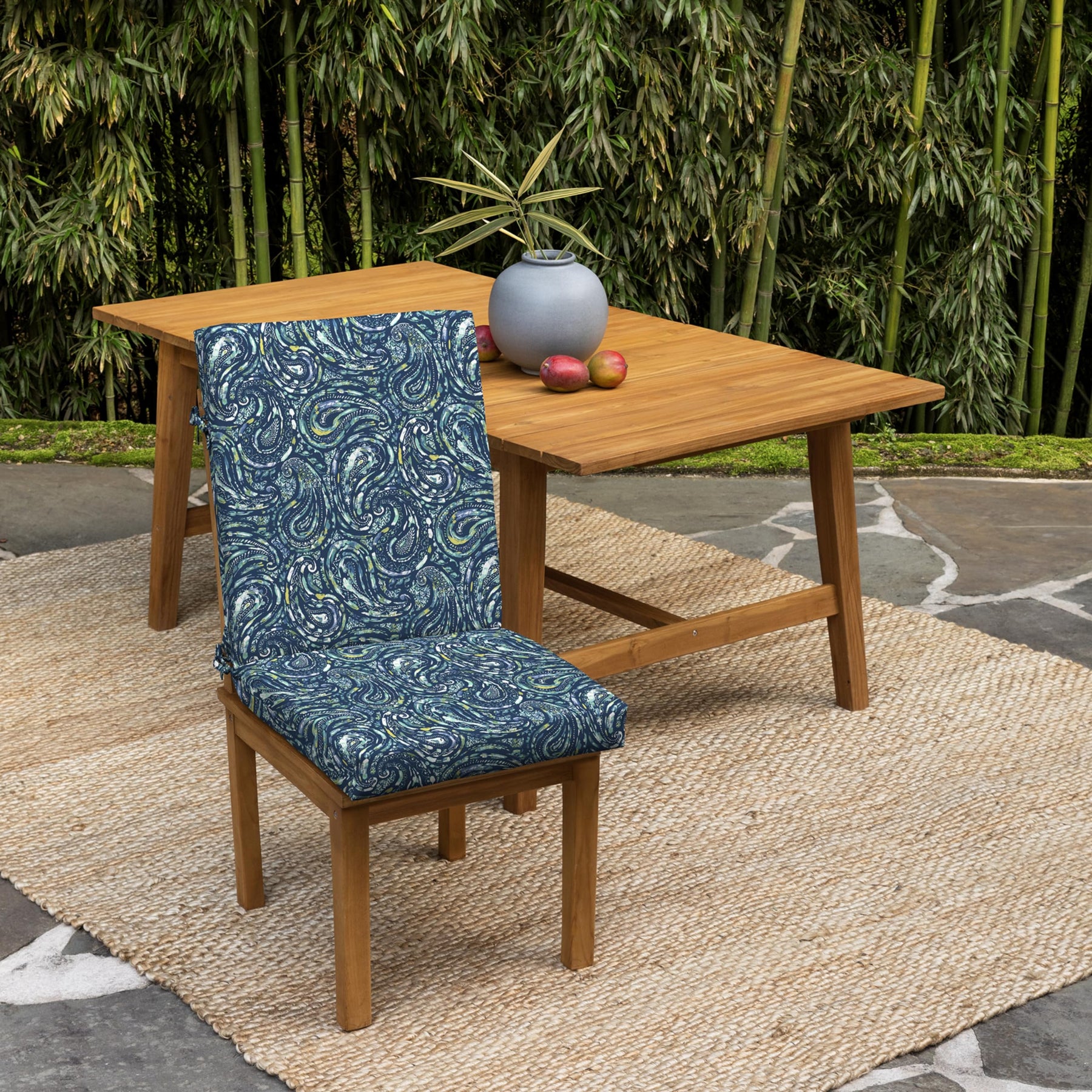 Dimensions: 20 in W x 44 in L x 3.5 in T (back is 20 in W x 24 in H and seat is 20 in W x 20 in L) | Plant-based fabric made from earthFIBER contains 50% bamboo viscose and 50% polyester | Skin-safe PFAS-Free C0 Treatment | Fits most standard outdoor dining chairs | 4 sets of ties to keep your cushion firmly in place | Filled with partially recycled polyester fiber fill that helps retain shape over time | 1-Year limited fabric warranty | Cleans easily with soap and water