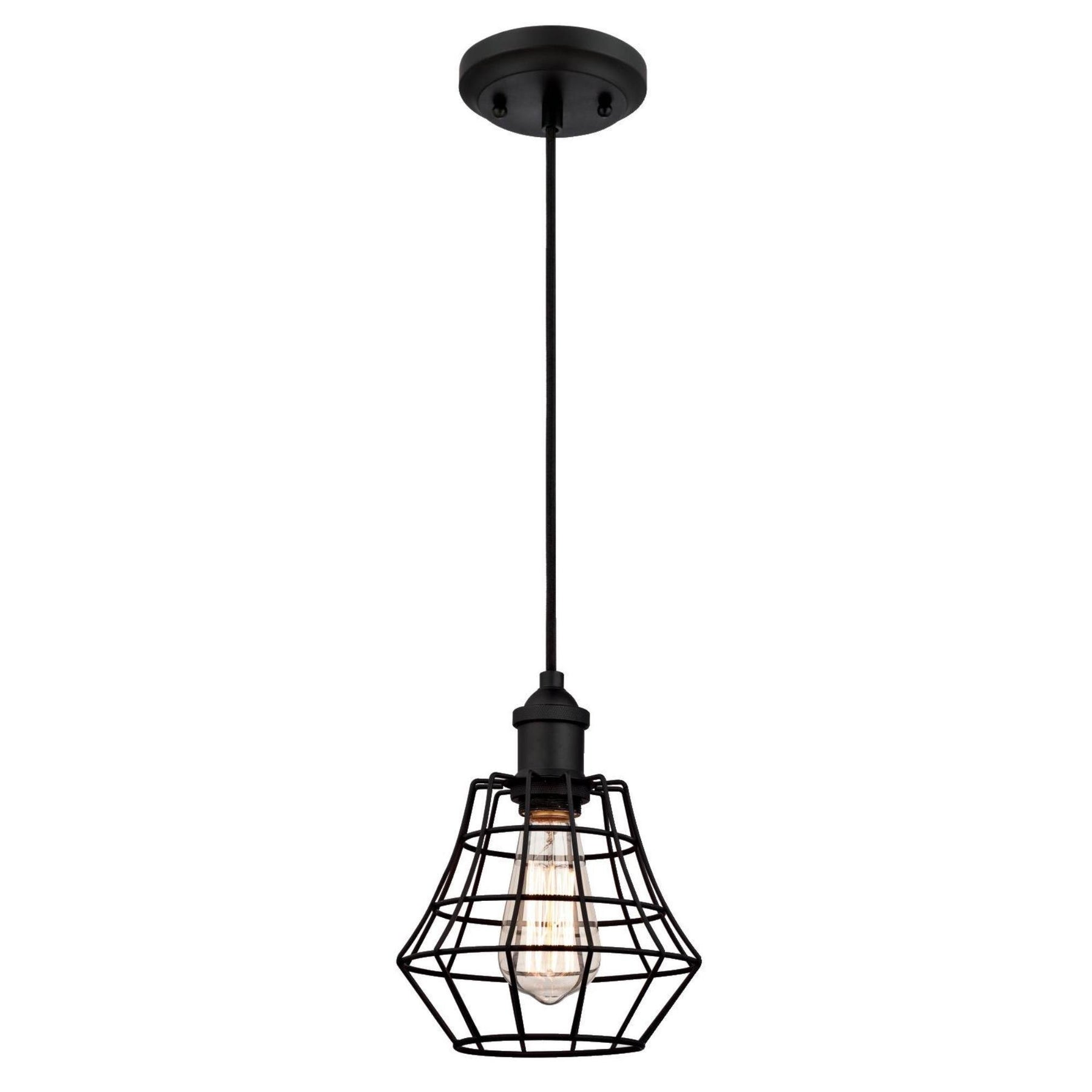 One-light Mini Pendant with angled Bell cage shade and Matte black finish adds understated retro style to any room | May be installed on sloped ceilings, includes instructions and mounting hardware for easy installation | Height 9 1/4 inches, Diameter 7 1/2 inches, Adjustable cord length 50 inches, Maximum hanging length 61 inches | Uses one 60-watt medium-base light bulb (not included), for vintage appeal use Westinghouse timeless or filament LED light bulbs | Five-year limited warranty against defects in materials and workmanship, ETL/cetl listed