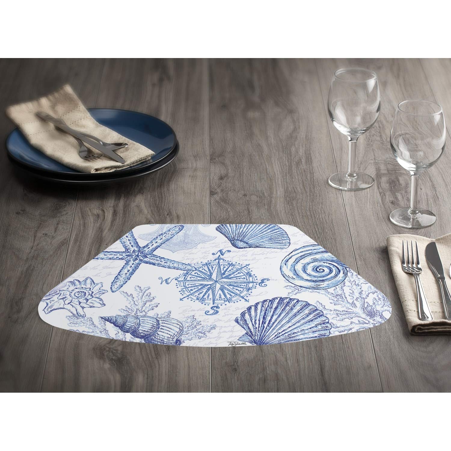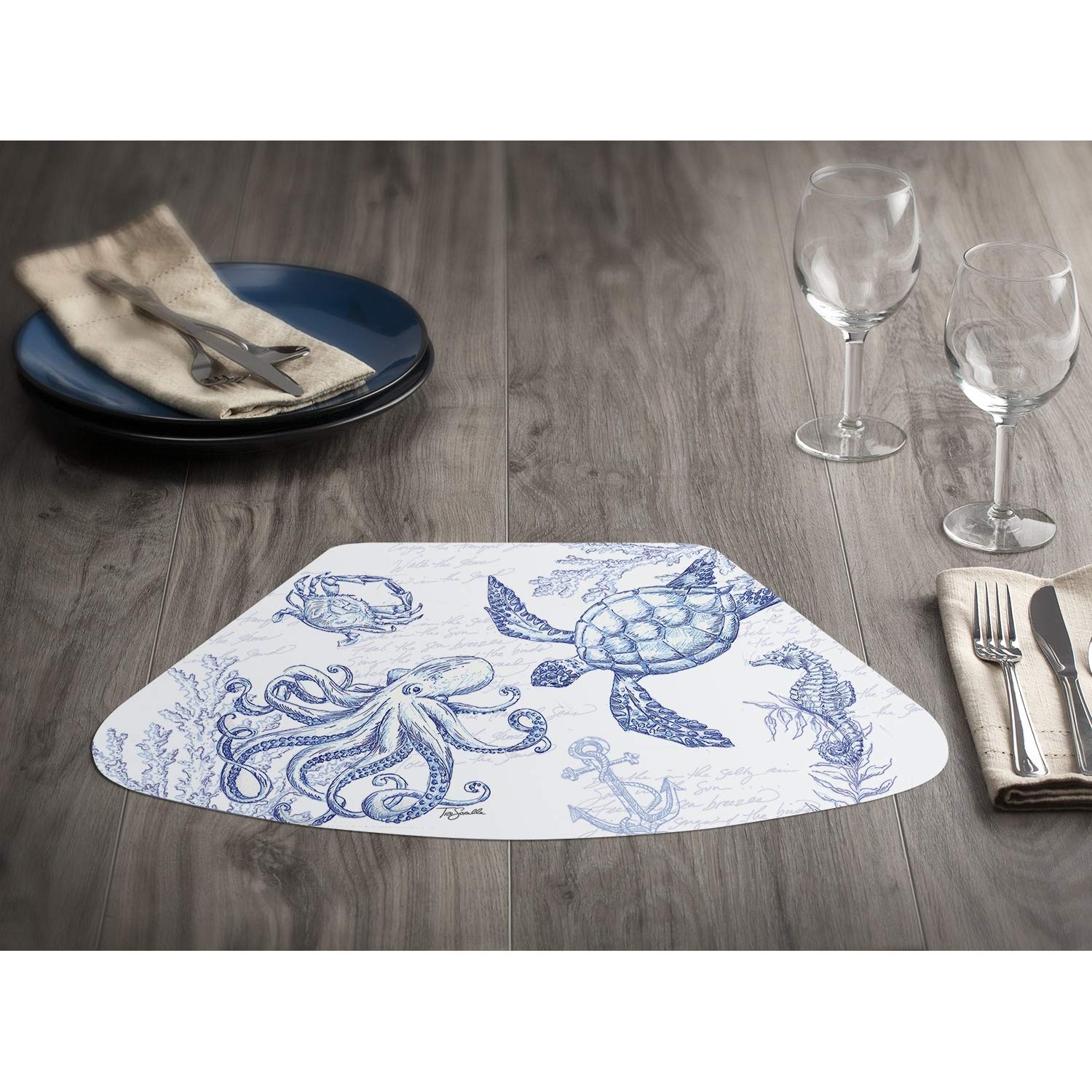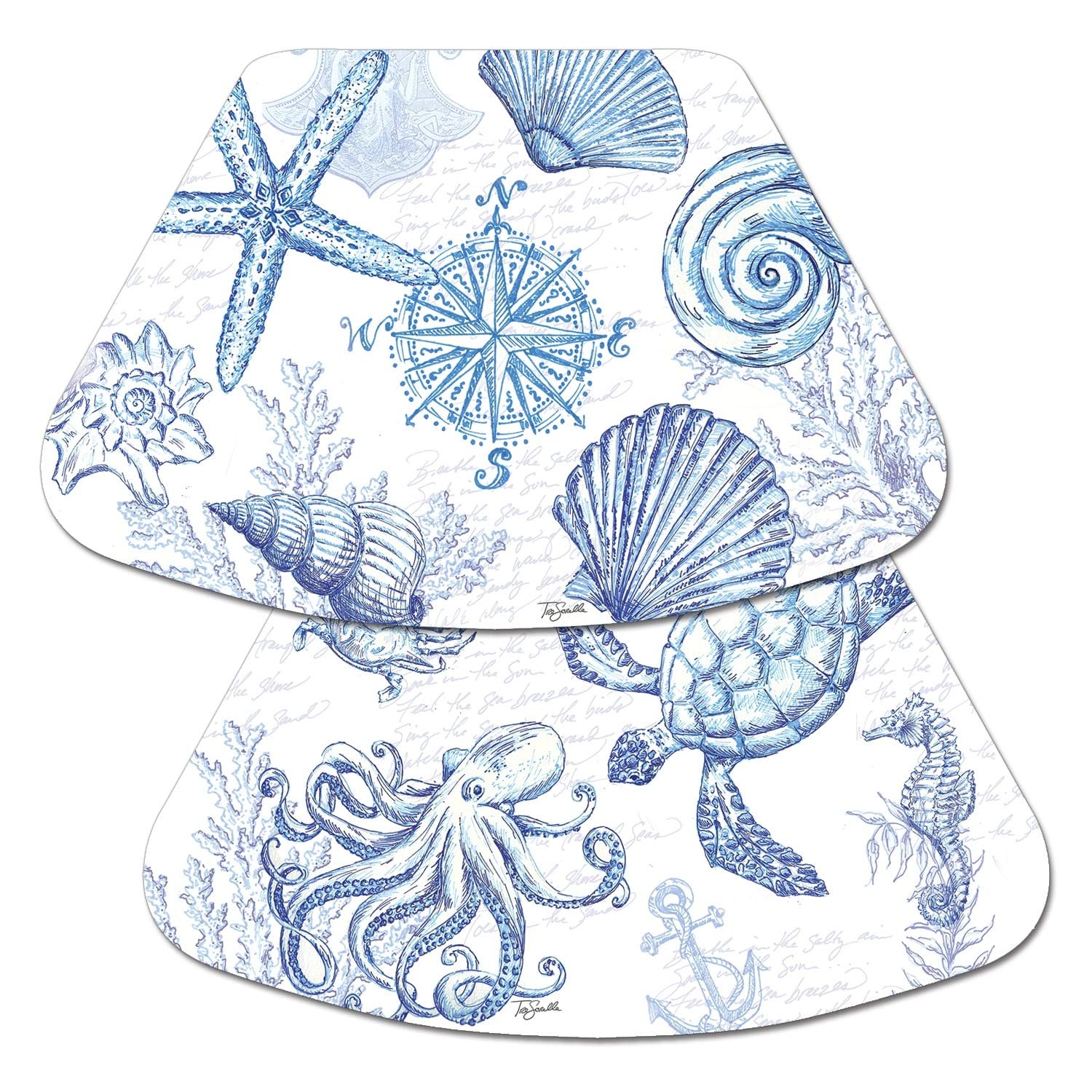 Reversible Wipe-Clean Wedge Shaped Placemats Set of 4 Coastal Sketch