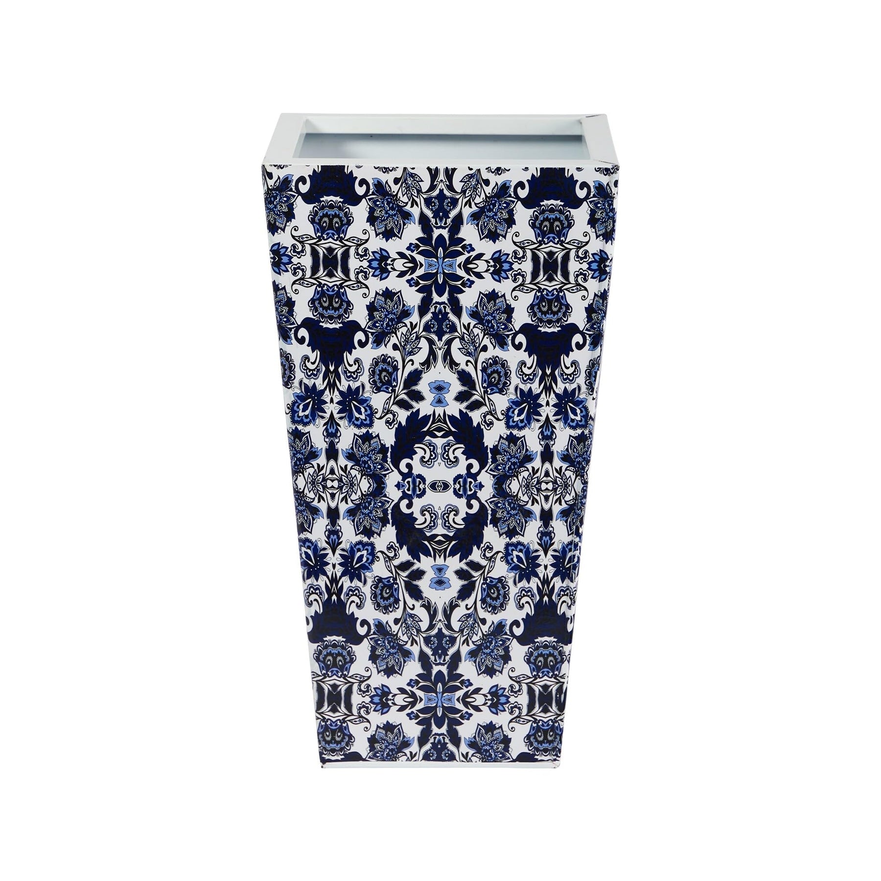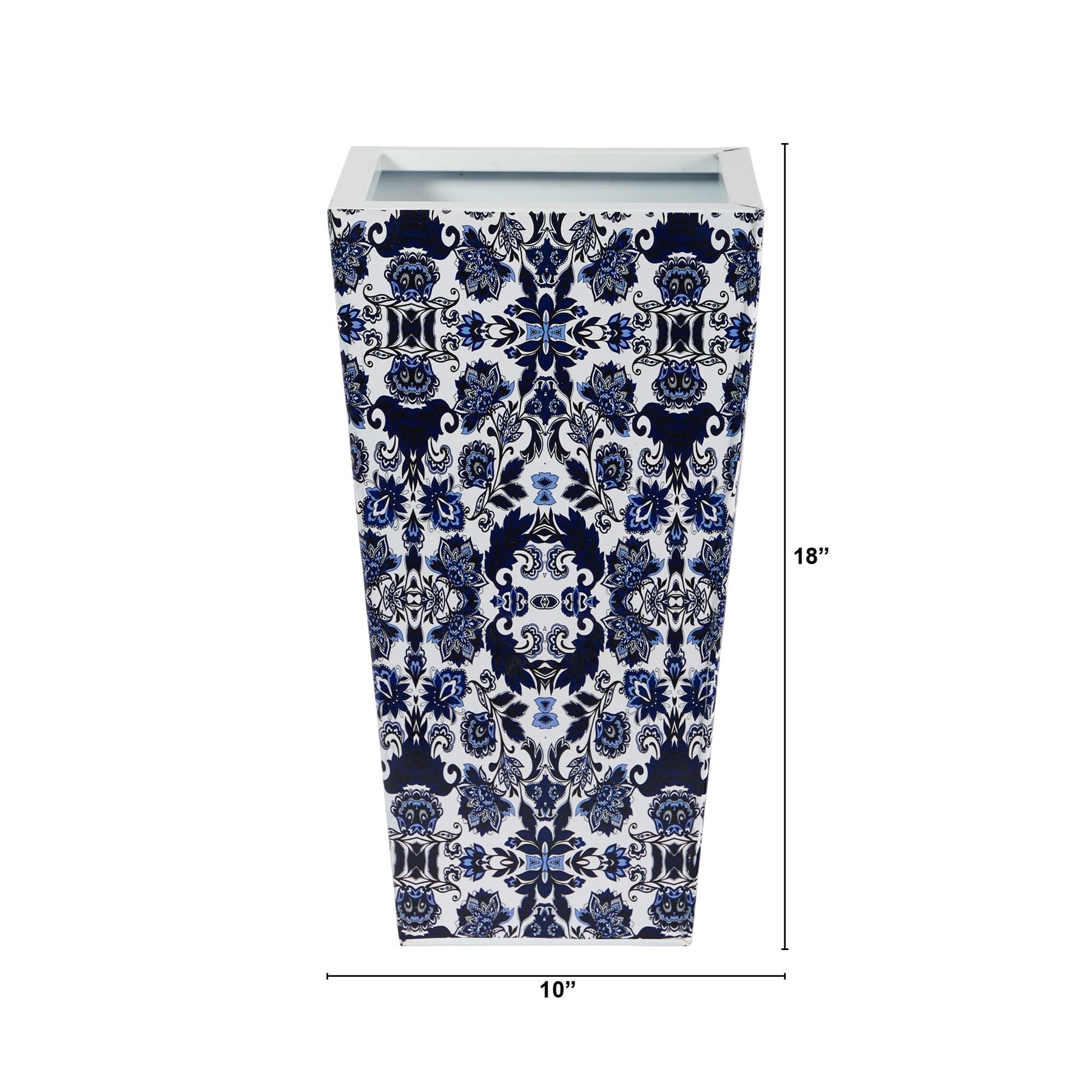 18" Oriental Blue And White Classic Metal Planter Traditional Distressed | Design/Look : Traditional. Material : Metal. Color : Blue. Distressed | Product Size: 10.0 In. L X 10.0 In. W X 18.0 In. H.