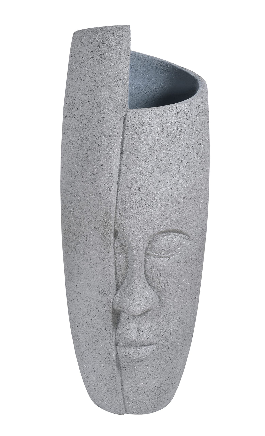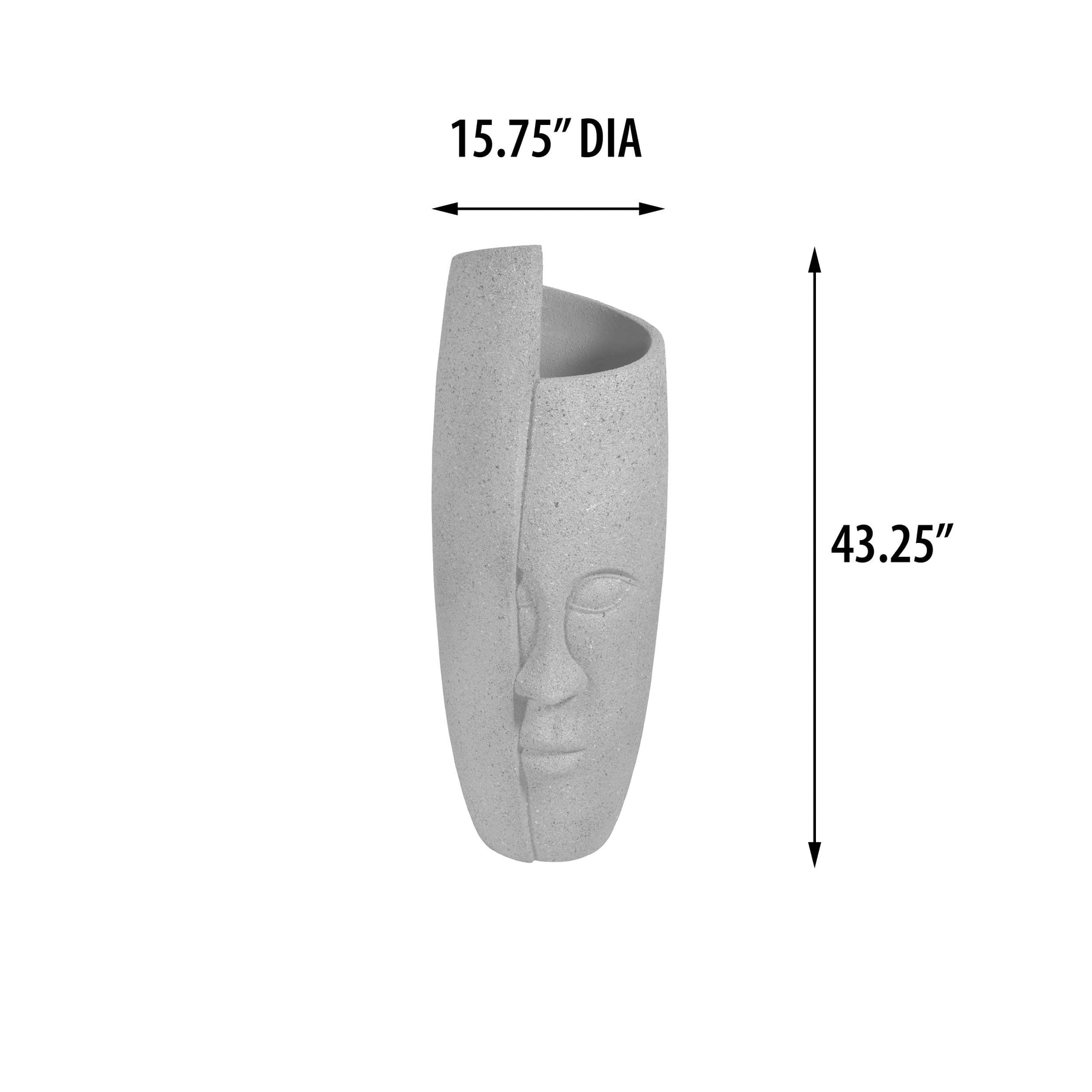 Our Bourgeois Tall Face Planter stands 43.25 Inches Tall. Our unique Bourgeois series of planters come in 3 graduated heights for creating interesting displays. Fill with flowers for enhanced function or use as stand alone decorative objects. The item is hand Cast in durable all weather indoor or outdoor Fiberglass with an exterior Rough stone granite grey finish. No assembly Required. Buy one size or combine with other sizes.