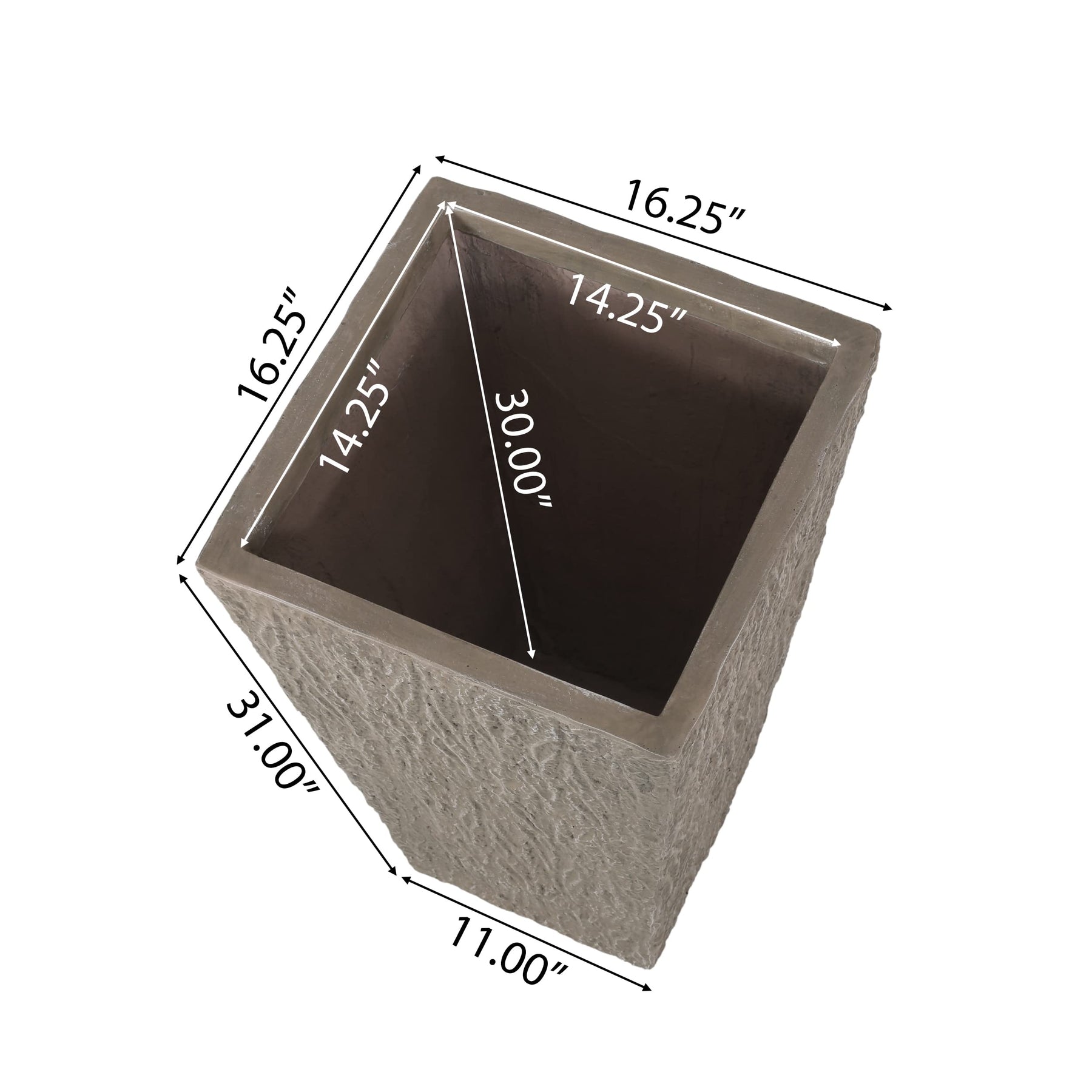 A TOUCH OF PERSONALITY: Bring your outdoor area to life with our delightful cast stone planter. With a sleek tapered structure, this accessory will not only enliven your backyard or patio space but also provides space to grow plants. | CAST STONE: Constructed with lightweight concrete, this planter offers a natural stone look with a beautiful brown wood texture that also has a highly durable structure and is resistant to outdoor elements. | DRAINAGE HOLE INCLUDED: This planter includes a drainage hole at the bottom so that excess water will not pool. This prevents water from becoming stagnant, which promotes healthier roots. | TWO SIZES: Choose among two different sizes for an accessory that is perfect for you and your outdoor space. The large planter is 16.25" W x 16.25" D x 31.00" H, the medium planter is 12.50" W x 12.50" D x 26.75" H. You will love how much your space can transform with the simple addition of this accessory. | NO ASSEMBLY: This planter comes ready to use straight out of the box. No assembly is required.