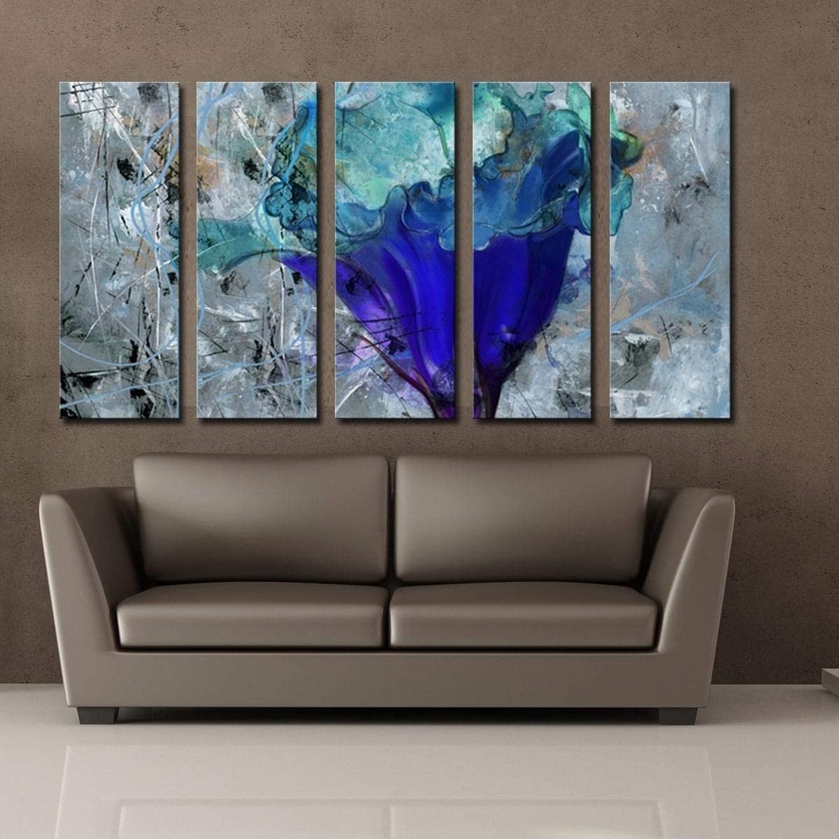 • Made in the U.S. by Ready2HangArt. Gallery-wrapped canvas set on a wood frame. 'Painted Petals LX' Digital Art. The essence of a chalice shaped flower dissipates on a gunmetal grey background. Rectangle with Landscape Orientation. Features tones of Blue, Indigo, Black, Grey, Brown, Turquoise, Soft White. 5-Panels: 30 in. H x 12 in. W (Overall Size: 30 in. H x 60 in. W). Style : Classic, Modern & Contemporary, Shabby Chic. Material : Wood