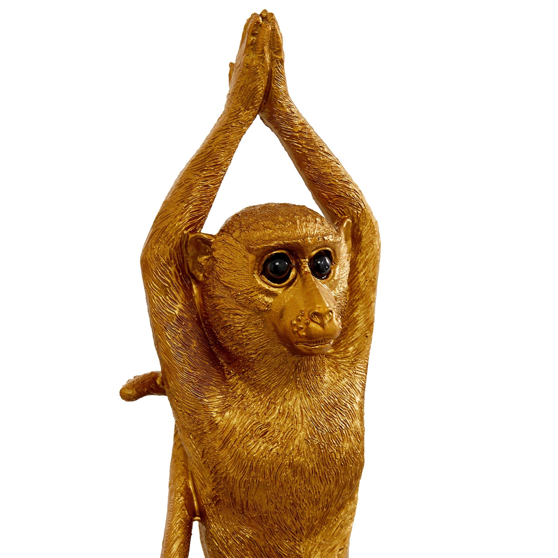 Metallic Gold Monkey Sculptures Set Of 3 4 X 11 Resin | Trio of gold monkey sculptures in lotus pose, tree pose, and sitting gyana mudra hand pose. Solid resin construction with powdered stone overlays. Monochrome metallic gold paint finishes with glossy black eyes. Suits eclectic and boho style spaces. Set of 3 gold monkey statues measure 3.75"L x 4"W x 11"H, 5"L x 4"W x 9"H, 5.5"L x 4"W x 6.75"H and collectively weigh 2.5 lbs. Material : Resin. Accent type : Figurine. Assembly : Assembled. Season or holiday : All Seasons