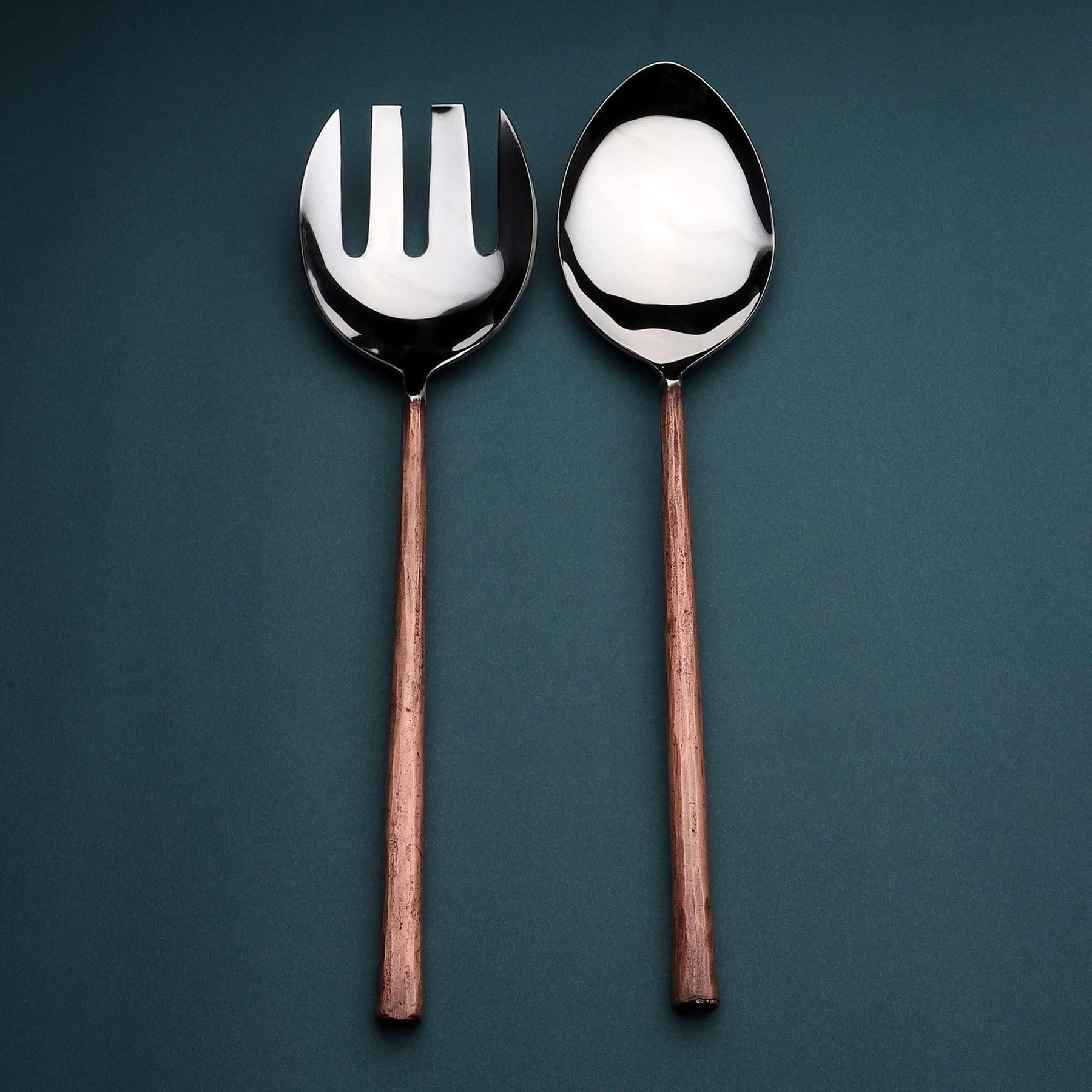 Our Sundance Salad Serving 2 Pc. Set accentuates your table setting. This handcrafted design features a mirror polished serving fork and spoon with tapered antique copper handles. The simple, yet sophisticated design is the perfect counterpart to a modern farmhouse or chic industrial dinnerware.