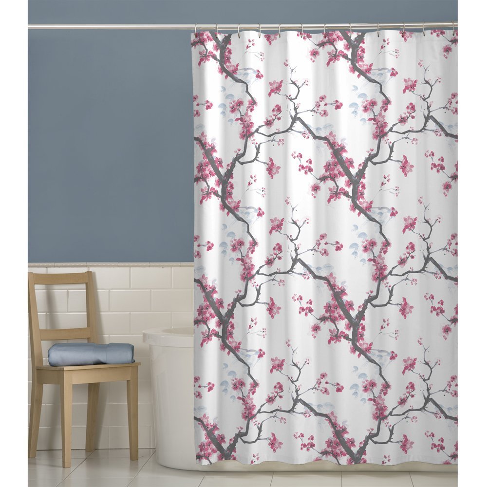 DESIGN: Featuring a beautiful floral cherry blossom design on soft microfiber. The inviting hues of pink, red, grey and brown on a white background will instantly brighten up your space | MEASURES: 70 inches x 72 inches and fits standard size shower / bathtub areas | EASY CARE: The fabric shower curtain is machine washable for easy care | BUTTONHOLE TOP: Durable buttonhole top allows for easy hanging with various style shower curtain hooks and rings