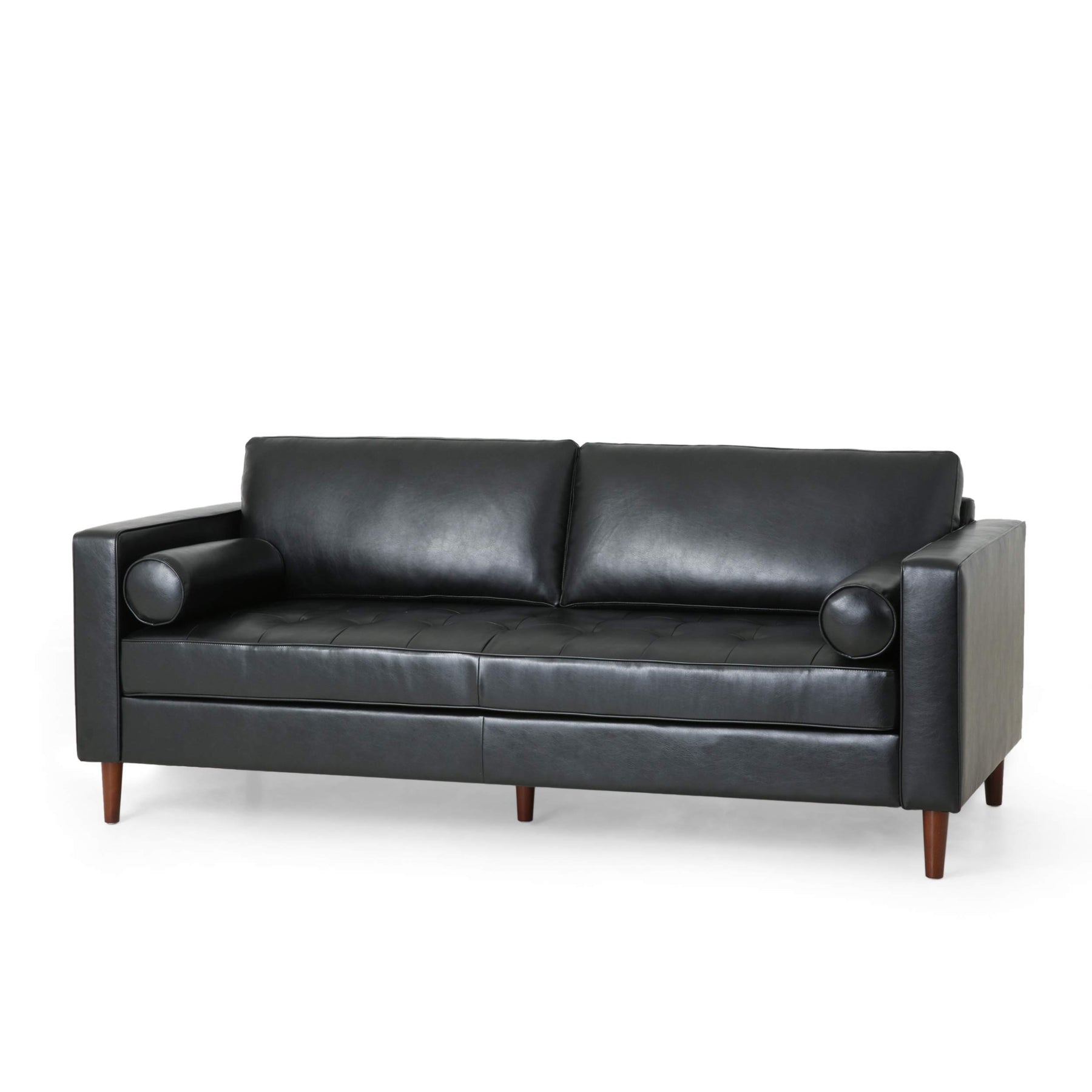 Anchor your home in utmost style that brings your interior space to the next level. Perfectly balancing smooth upholstery with tapered birch wood legs, our impressive three-seater sofa offers your home a charming mid-century modern upgrade. This piece offers a beautiful button tufted design that is finished with waffle stitching in the seating, making this a streamlined statement piece that can change the whole flow of your living room. Completed with lovely rolled accent pillows, this refined sofa will turn any interior space into a stunning masterpiece. Includes: One (1) Sofa Material: Faux Leather Leg Material: Birch Wood Color: Midnight Black Leg Finish: Espresso Hand-Crafted Details Assembly Required Dimensions: 33.00 inches deep x 82.25 inches wide x 33.00 inches high Seat Dimensions: 21.00 inches deep x 72.00 inches wide x 19.00 inches high Arm Height: 27.00 inches