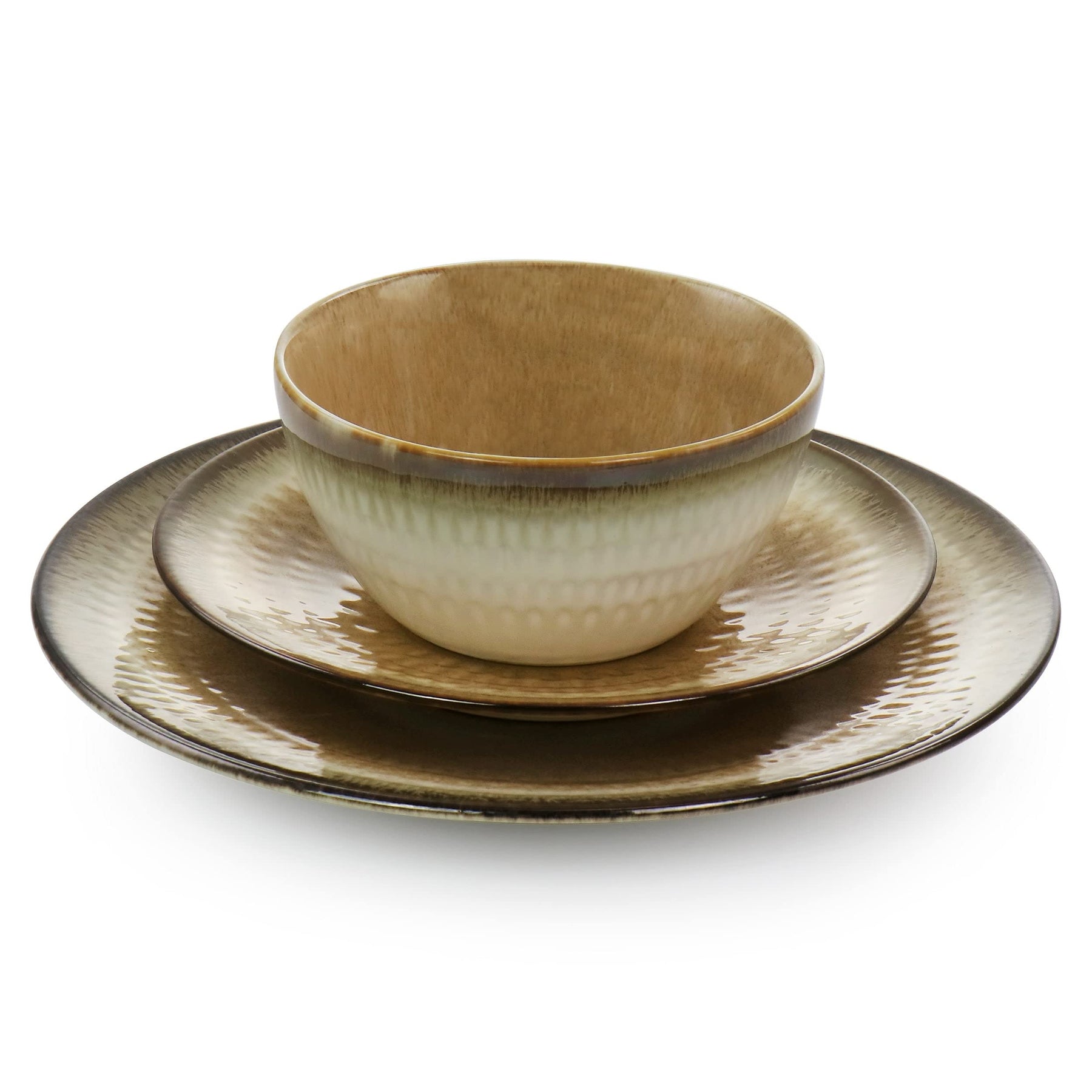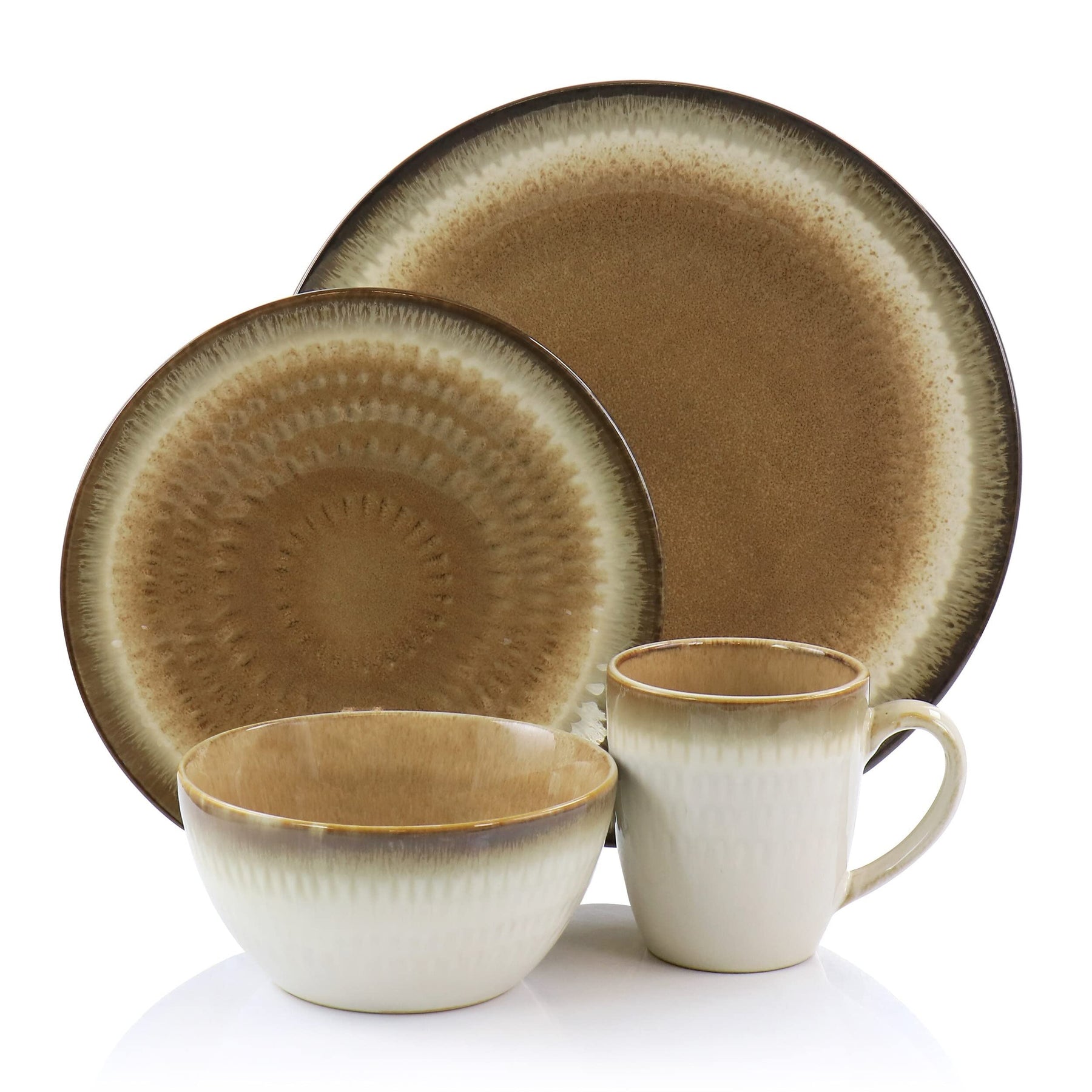 16 Piece Ceramic Dinnerware Set In Brown Textured Casual Round