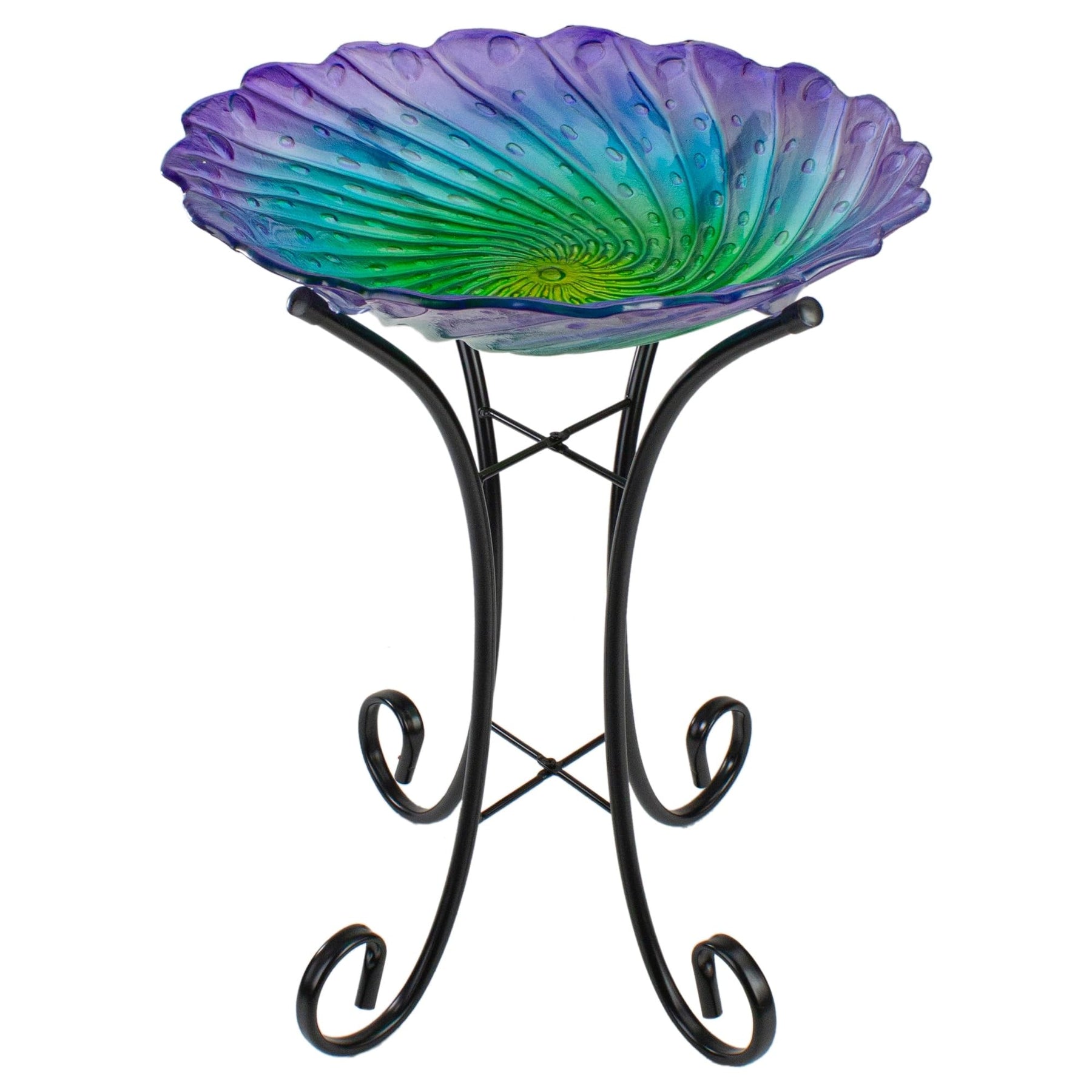 18" Purple and Green Swirled Hand Painted Glass Outdoor Birdbath