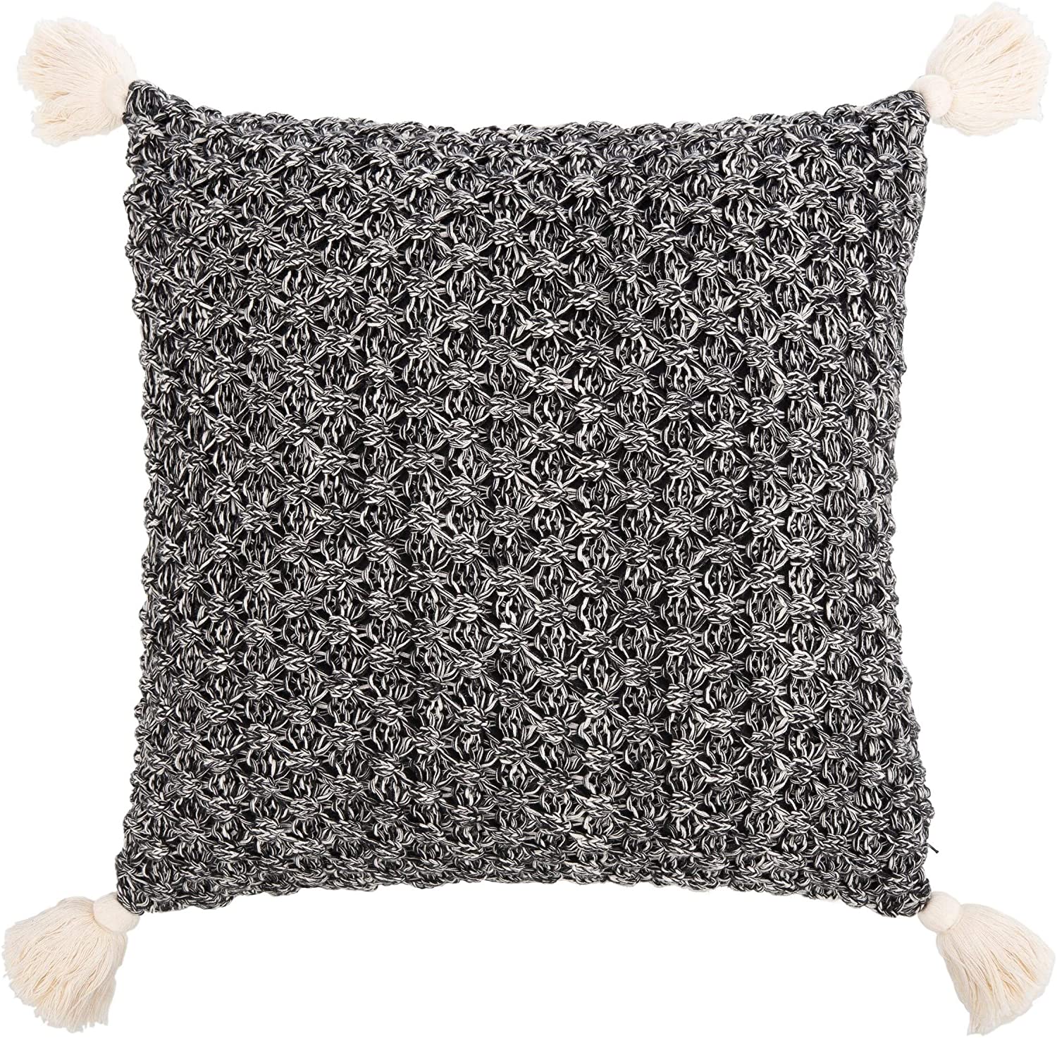• 20" Knit Tassel Pillow Beige Black Textured Modern Contemporary Cotton Single