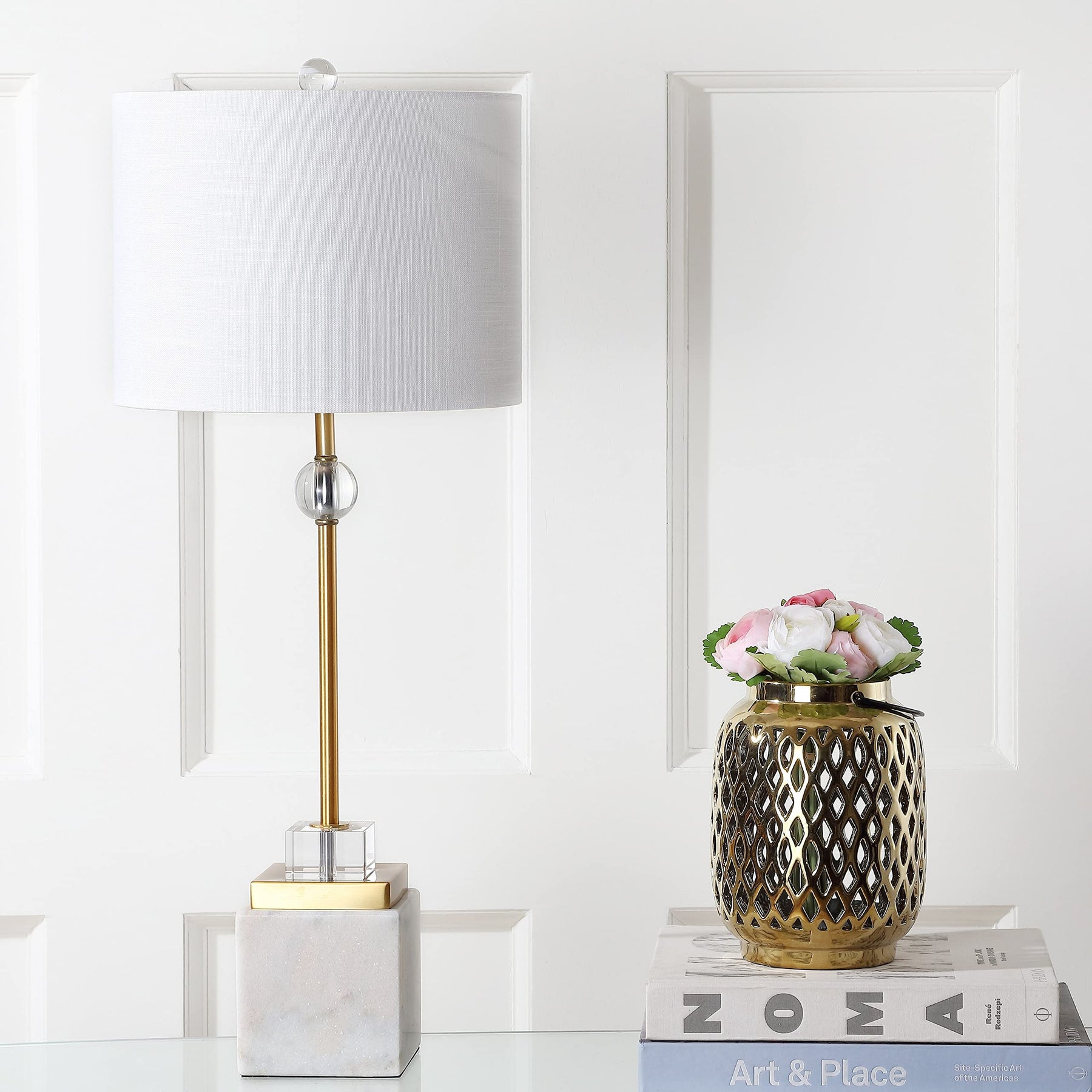 30" Marble/crystal Led Table Lamp Brass (Set Of 2) White Yellow Glam Traditional Transitional Bulbs Included | Marble, crystal, and brass -- the elements of this glamorous table lamp shine under its 30" of height. 100% cotton hardback drum shade. 60" silk cord with standard USA 2-prong plug. On-off switch on socket. Takes one maximum 100 watt or equivalent bulb. UL Listed. Color: White/brass gold with white shade. Body Material Info: Marble / Metal / Crystal. Base Material Info: Marble. Includes: Two (2) lamp(s). Minor Assembly Required. Shade: 9 inches high x 12 inches wide x 12 inches deep | Lamp: 30 inches high x 12 inches wide x 12 inches deep. Design/Look : Glam, Traditional, Transitional. Shade material : Linen. Switch type : On-Off Rotary Switch. Base material : Crystal, Metal, Stone. Base shape : Pillar. Color : White, Yellow. Color temperature : Warm White 2700K - 3000K. Exact bulb wattage : 9. Lamp height : 25 to 30 Inches. Light bulb type : Fluorescent, Incandescent, LED Compatible. Bulbs Included.