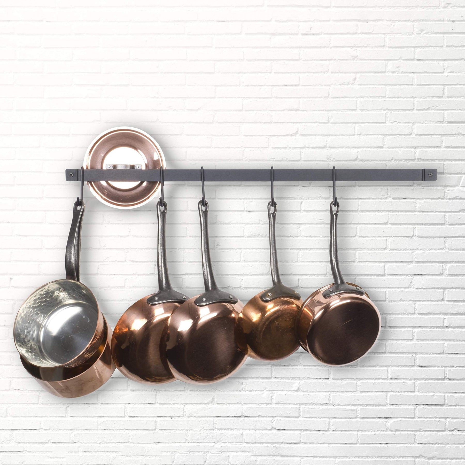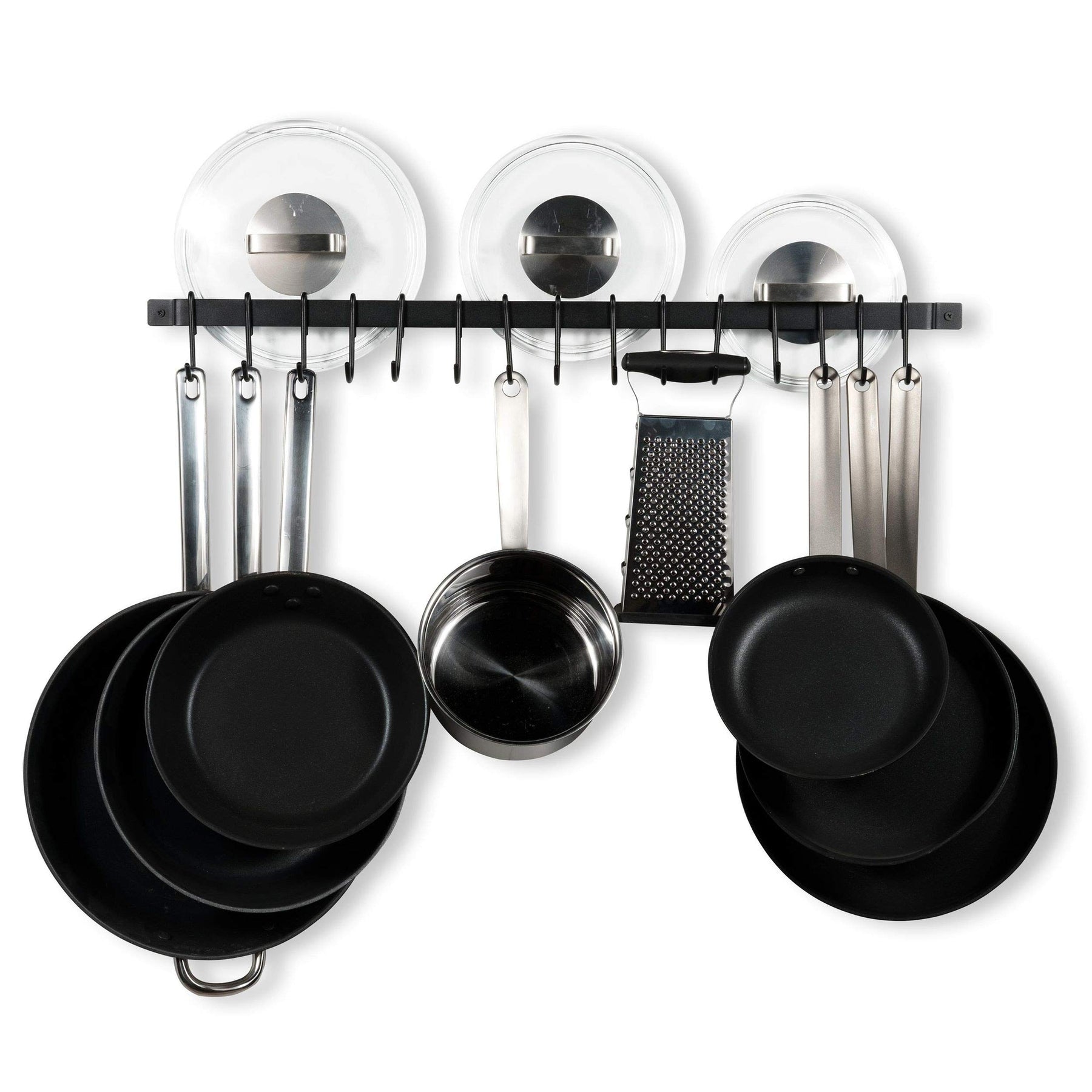 30" Pot Rack With 15 Hooks Steel Utensil Holder Black Stainless | Great Kitchen Organizer: Ideal for hanging pots, pans, cooking utensils, apron, oven mitts, gloves, and measuring cups. Practical Storage Solution: Utilize our metal rack anywhere you need extra storage and keep your most essential needs at your fingertips. Easy Installation: Our pots and pans organizer rail comes with all necessary mounting hardware. Just follow the instructions and your metal storage rack will be ready to use in a few minutes!. Product Size:H 1" x W 30" x D 1 | Sturdy: Made of steel, this wall rack with s hook set will serve you years to come. Each metal hook is 3.5 inches and sturdy enough to hold a substantial amount of weight. Coffee Station Organizer: Mount it above your coffee maker and hang your favorite mugs securely. Material Info:Steel. Color:Black. Weight Capacity: Up to 15 lbs if mounted on to drywall with included anchors and screws.